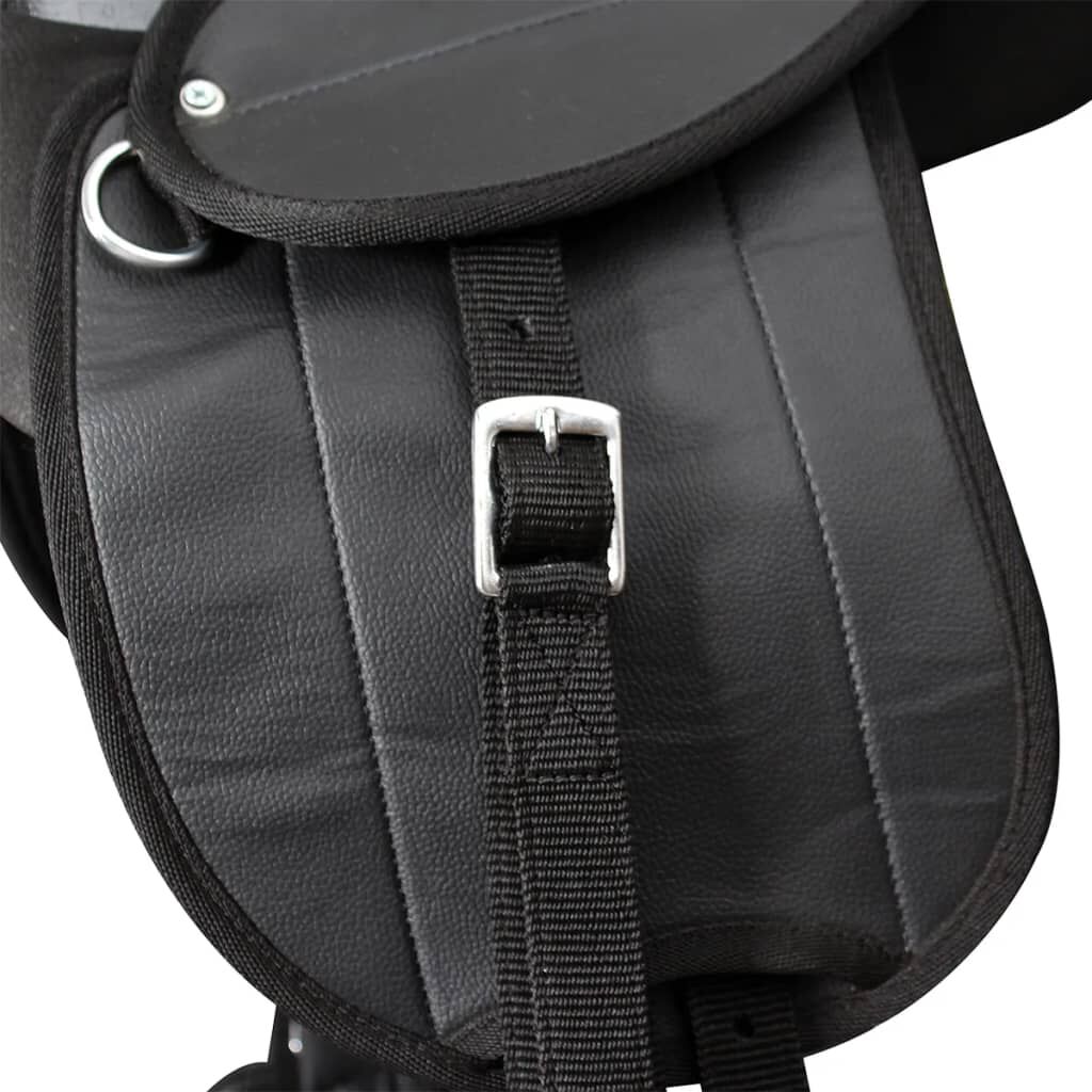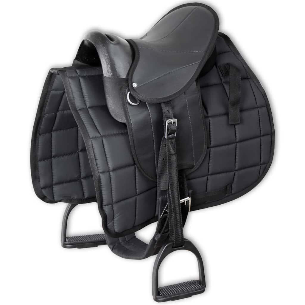 $168.28This saddle set, including a saddle, a saddle blanket, stirrups, stirrup belts and a girth, is designed to place the rider in the correct position, thus ensuring a secure and balanced ride. This saddle is designed with a combination of aesthetics and practicality. It is reinforced at all pressure points for added durability. The saddle blanket, made of polyester, is well padded for the horse's comfort and can be detached for easy cleaning. The stirrups, made of high-quality plastic, are solid enough for years of service. The stirrup belts and the girth are firm to ensure your riding safety. This light seat is comfortable enough to last you long hours out on the trail. In addition, it’s quite easy to saddle up.