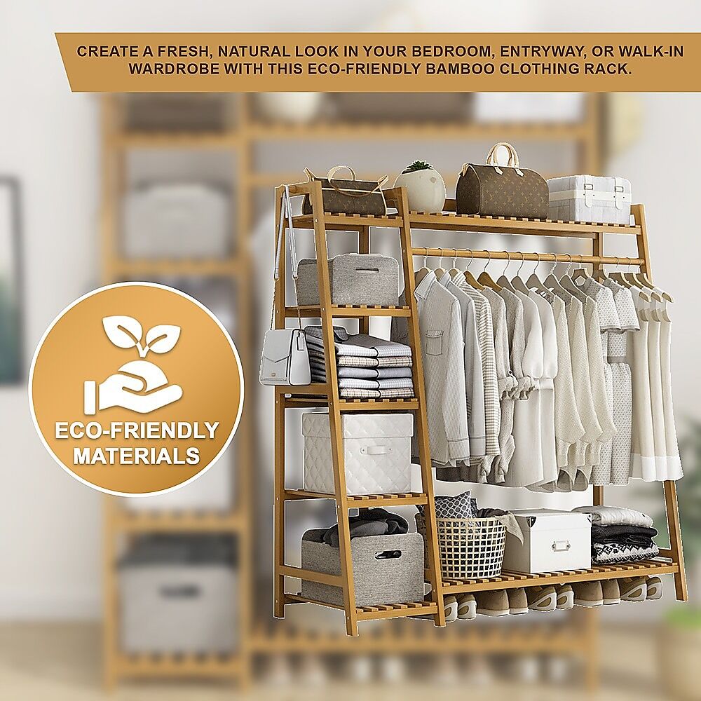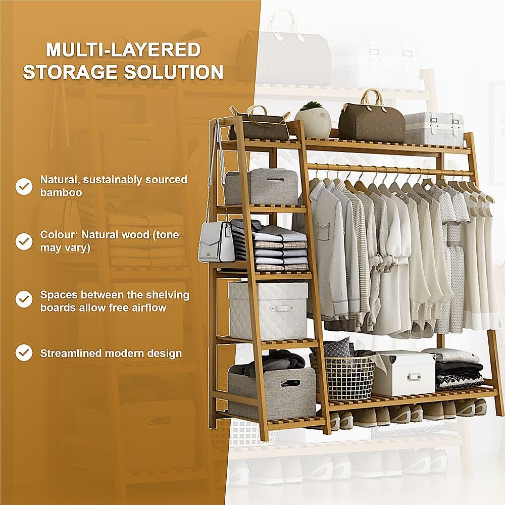 $101.64Create a fresh, natural look in your bedroom, entryway, or walk-in wardrobe with this eco-friendly bamboo clothing rack by Randy Travis Machinery. With five tiers of storage, hooks, a hanging rod, and seven shelves, you'll have plenty of space to organise your entire clothing, accessories, and shoe collections. Crafted from solid natural bamboo, this clothing rack has an uncluttered, Nordic-inspired design that will accent your room's décor. Done in a neutral finish, it will blend in well with the colour scheme in nearly every home.