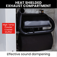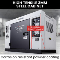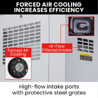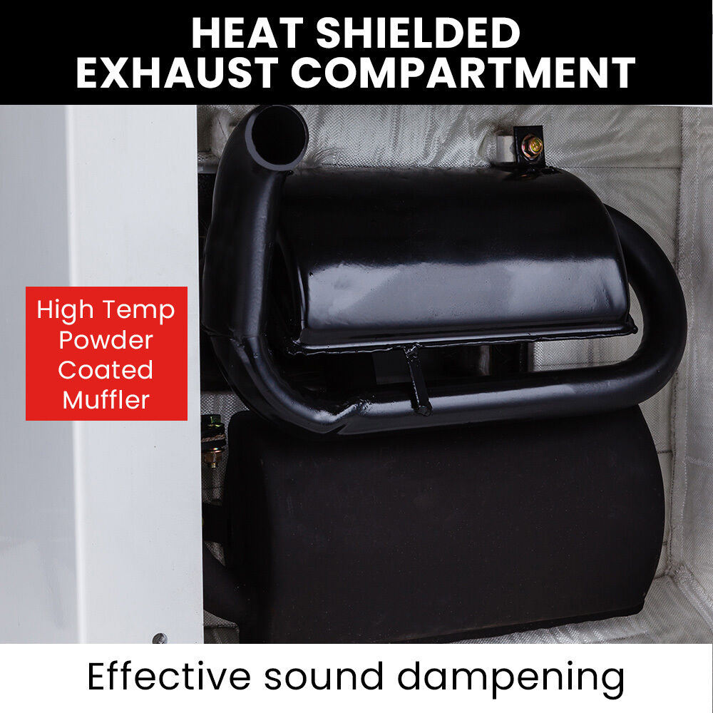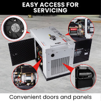 The generator’s design is both practical and ergonomic. The dual swing access doors are lined with thick sound insulation, minimising noise during operation. The muffler is also in a well-ventilated sound-damping compartment. The extra-large doors provide easy access to internal components, making maintenance quick and easy. It also has casters included should moving it around a warehouse, workshop or onto a lift for transportation be necessary.