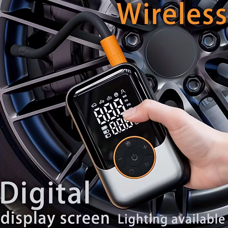 This portable wireless air compressor tire inflation pump integrates rapid inflation, digital tire pressure monitoring, emergency LED lighting and rechargeable battery. It is an all-round inflation assistant for cars, motorcycles, bicycles and sports balls. The lightweight body design makes it more convenient to carry around and is an ideal tool for car owners' emergency kits and cyclists' daily use.