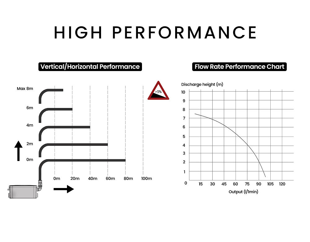 The Shower Plus runs quietly thanks to the smooth 200W copper wound motor and rubber feet. It is capable of pumping up to eight metres vertically and 80 metres horizontally.