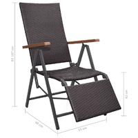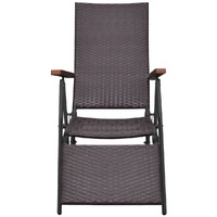 This quality reclining deck chair is a perfect combination of style and functionality. It has a 100% aluminium frame and a PE rattan seat and backrest and has been designed to be used outdoors year round. It will provide a comfortable place for you or your family or friend to sit while chatting, reading or relaxing. The chair's backrest is adjustable in 7 different settings, so you can always find the most comfortable position. The 100% aluminium frame is very sturdy and durable. The weather-resistant PE rattan makes the chair easy to clean. The armrests are made of durable wood-plastic composite, which is weatherproof and UV resistant. The seat has an additional place for foot rest which can be folded up while not in use. Since the chair is lightweight, it can be easily moved around and it is foldable to save space. Note: We recommend covering the chair in the rain, snow or frost.