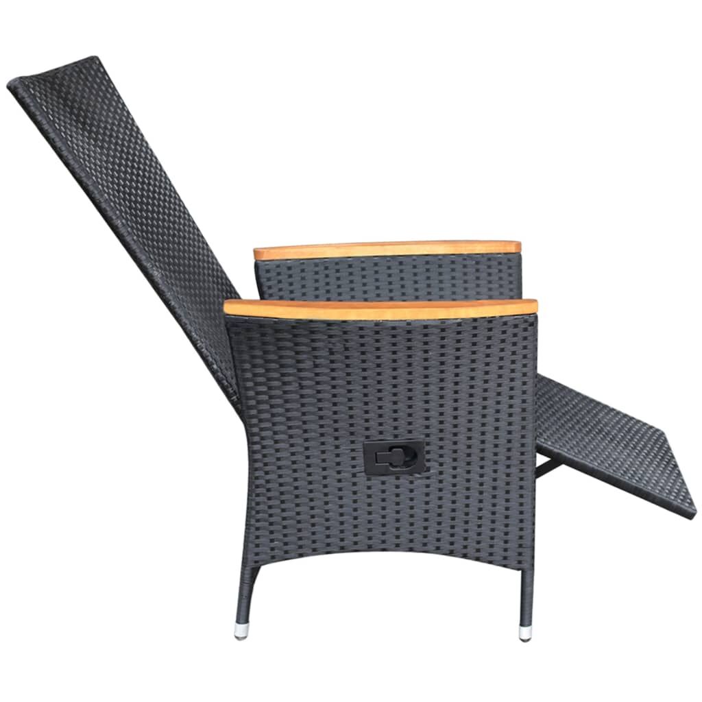 $211.99This set of 2 rattan reclining garden chairs has an elegant design and will become the focal point of your garden, patio or balcony. Made of weather-resistant and waterproof PE rattan, these dining chairs are easy to clean, hard-wearing and suitable for daily use. The powder-coated steel frame make the chairs very sturdy and durable. The armrests are made of acacia wood, a tropical hard wood, which is weather resistant. By touching the button on the side, the backrest will recline and the footrest will move up at the same time, for a comfortable lying position. Thanks to their lightweight construction, the chairs are easy to move around. The thick, soft, foam-filled seat cushions are highly comfortable and made of water-repellent polyester. The cushion covers with zips can be easily removed and washed. Delivery includes 2 reclining outdoor dining chairs and 2 seat cushions. Note: We recommend covering the chairs in the rain, snow and frost.