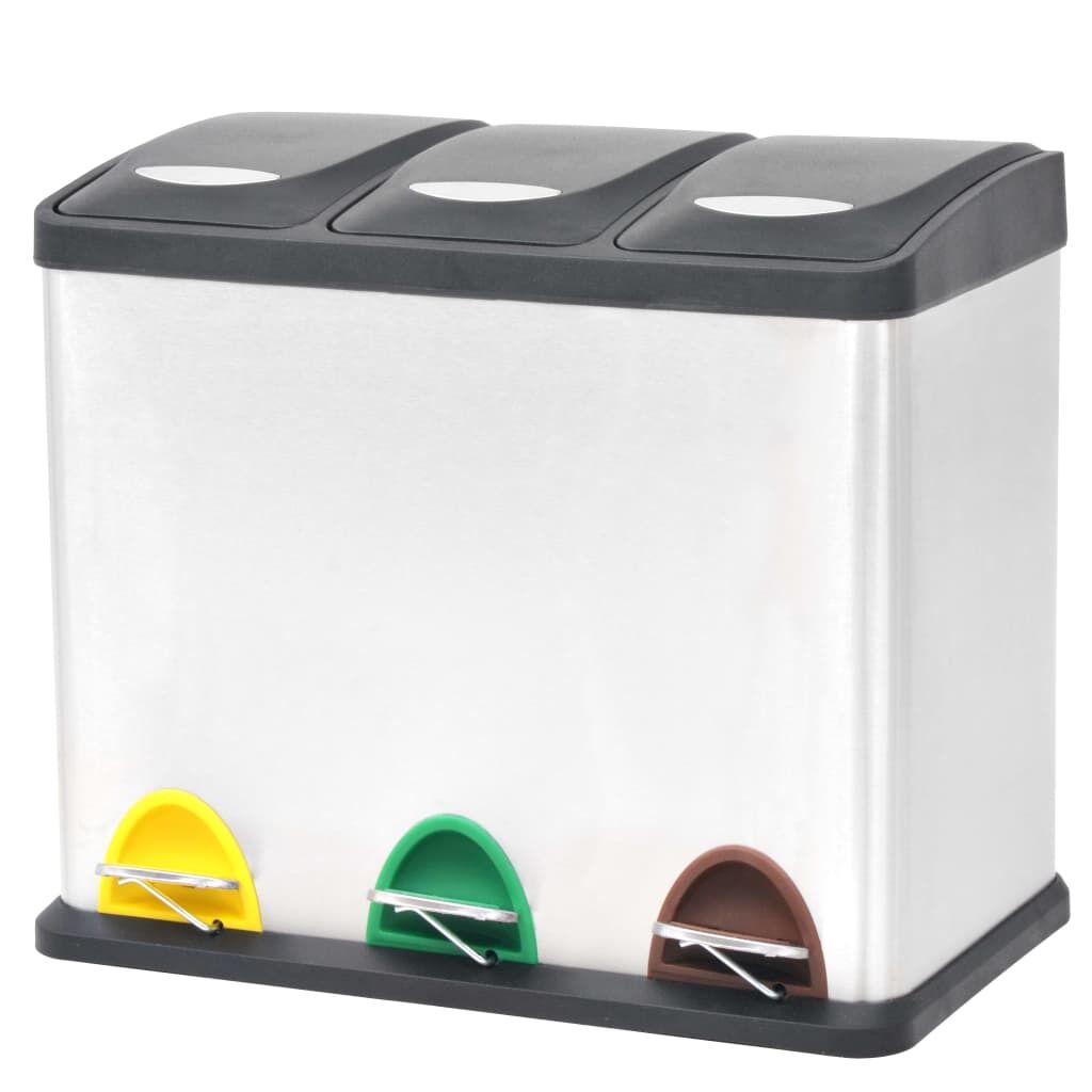 This chic, practical recycling pedal bin with soft-close lids is a must-have for your kitchen, living room, office, etc. The rubbish bin is equipped with 3 removable inner buckets for sorting the waste. You can effortlessly open or close the lids by pressing the pedals. The slots behind the pedals are colour-coded, which helps you to sort the trash more conveniently. The recycling bin has a stainless steel housing with a matte finish, which gives it a chic look. The inner buckets, lids and base are made of durable polypropylene (PP). The soft-close lids open/close quietly. When closed, the lids will prevent odours from spreading. Each inner bucket has a large handle and can be easily removed.