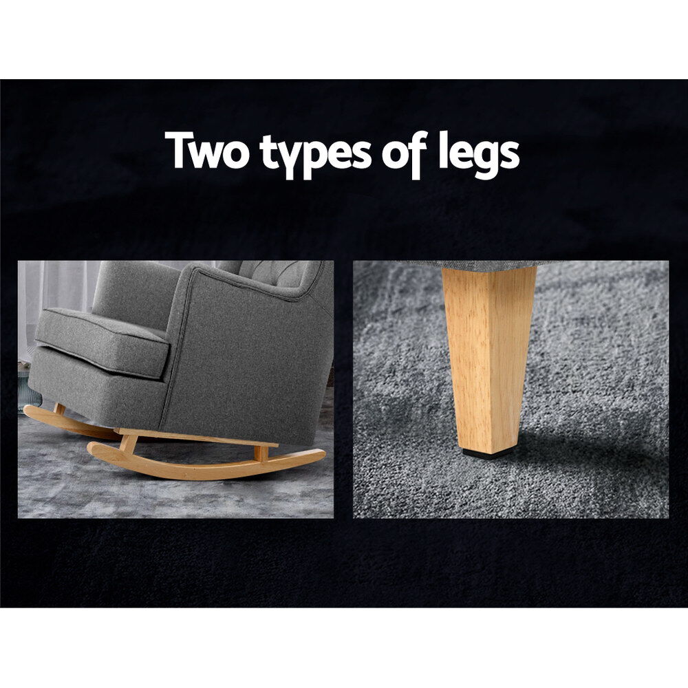 $258.29Be swayed. Rock on and relax with our Artiss Gaia Rocking Chair. It comes with two sets of removable legs so that you can use it as a rocking chair or a stationary chair. The gentle swaying of the rocking chair would be perfect for reading, listening to music, taking a much-needed nap, or even rocking your baby to sleep. Or simply swap the legs over and you have a classic accent chair. The iconic design and the tufted wingback exude elegance and timeless appeal. This makes the chair suitable for any décor, from your living room to your nursery. The extra thick foam padding and wide back ensure ultimate comfort with exceptional support. The armchair feet are fitted with pads to keep your floors pristine from scratches and damage. Together with a reinforced wooden frame and quality faux linen fabric upholstery, our armchair is guaranteed to stand up to durable use for many years to come.