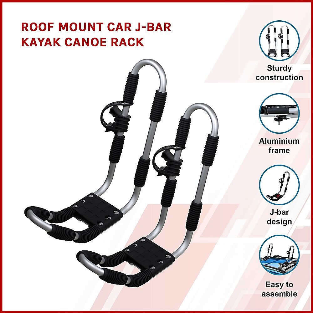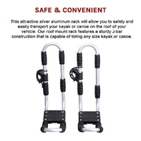 This attractive silver aluminum rack will allow you to safely and easily transport your kayak or canoe on the roof of your vehicle. Our roof mount rack features a sturdy J-bar construction that is capable of toting any size kayak or canoe. Once your kayak or canoe is tied down with the racks two thirteen-foot tie down straps, you can be confident of a successful transport.