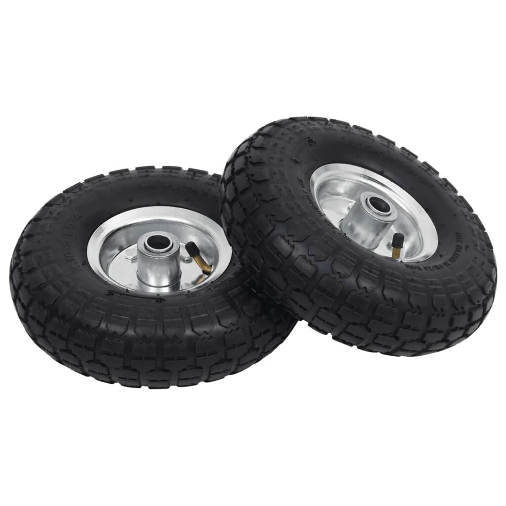These puncture resistant sack truck spare wheels are ideal for heavy-duty use when moving loads with your sack trucks, hand trucks, trolleys, carts, dollies, wheelbarrows, etc., even on uneven grounds. The pneumatic tyres are made of durable, abrasion-resistant rubber and have a special tread design that provides added grip at higher speeds. The wheel rims are made of sturdy metal. The spare trolley wheels have a universal size and can be easily installed to your sack trucks, trolleys, etc. Delivery includes 2 wheels.