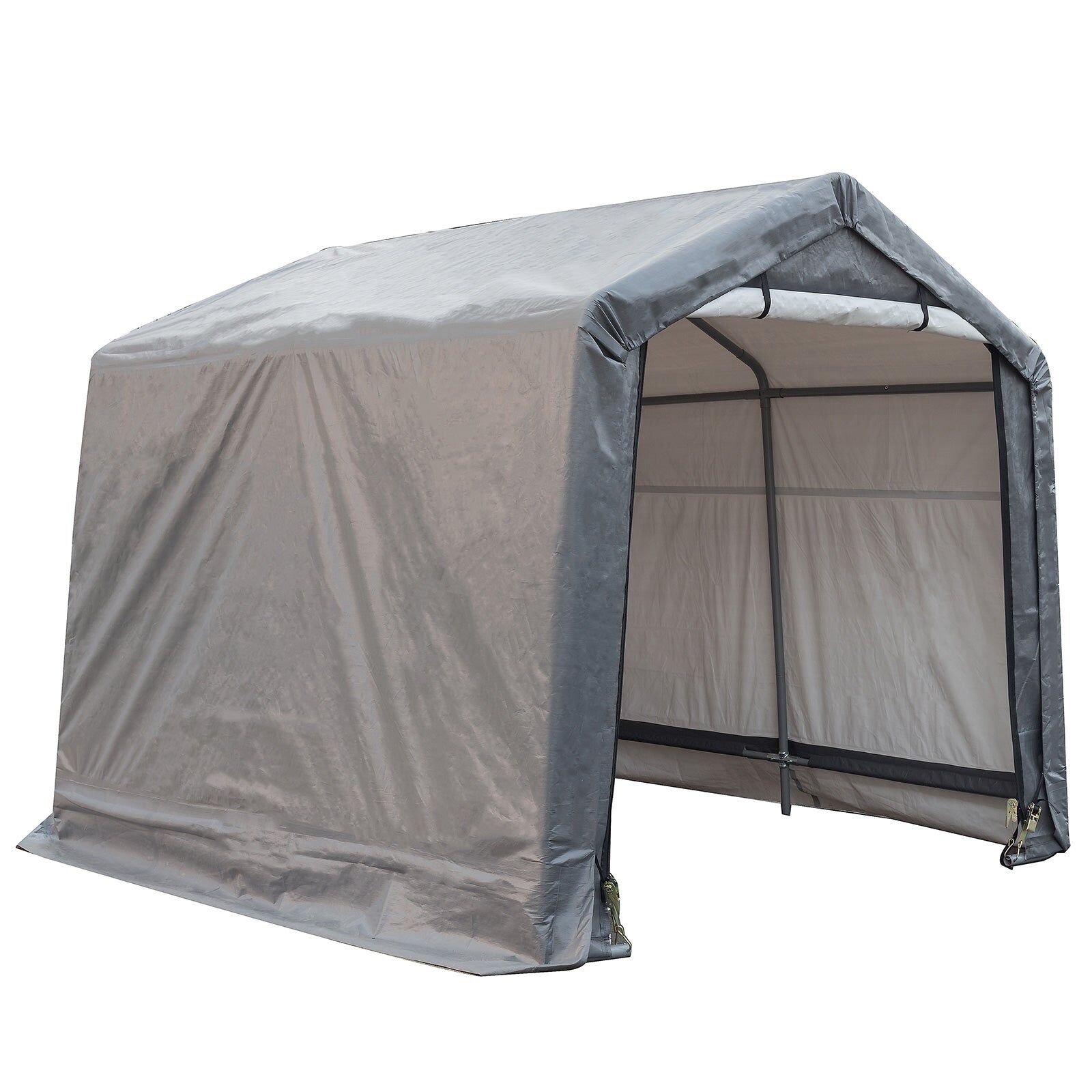 The storage shelter is made of durable PE, cover features UV-treated, waterproof, windproof, dustproof, and anti-snow. It has a roll-up zipper door, allowing for easy entry and exit, better visibility, promoting air flow, preventing moisture, and avoiding condensation caused by temperature differences or rain. You can roll up the door, or open one side to get in and out. It is designed with heavy-duty durable frame, constructed with high-quality steel pipes, reinforced by horizontal pipes on both sides, which can withstand high winds and various types of bad weather. And it has ground anchors included and but if four sandbags(excluded in this garage) are used, which can enhance the stability. The steel pipes of the portable storage shelter are easy to connect to each other. As each part of the outdoor storage carport is marked with number, you just need to follow the instructions in our package step-by-step to assemble the outdoor portable garage. This product will add your convenience and all your purpose use!