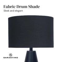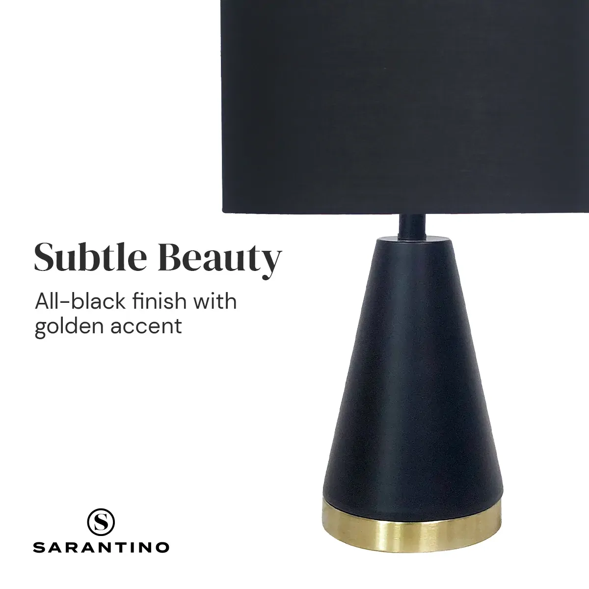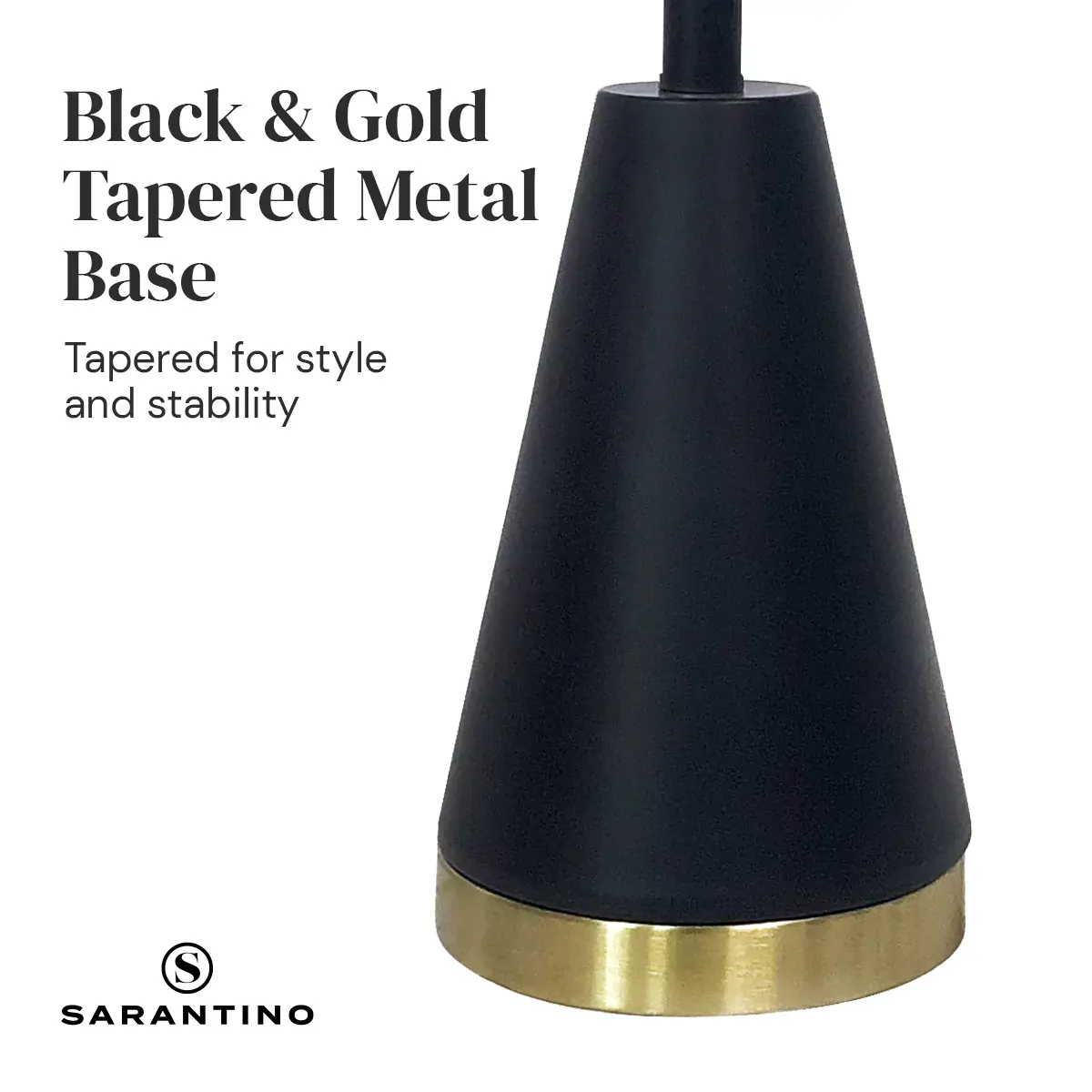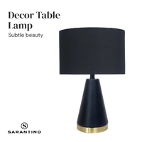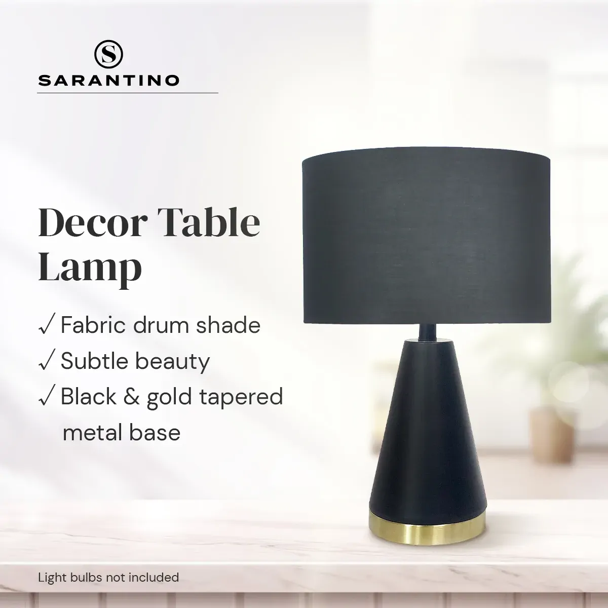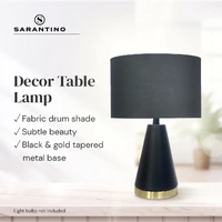 This table lamp, featuring a black and gold tapered metal base, securely stands on any surface or tabletop. It is a luxurious and elegant decor piece that will complement your space while adding illumination. The ingeniously crafted metal base is complemented by the black fabric shade. The glossy and sleek exterior brings out the best of your bedside, bedroom, living room, office, reading room, hotel or office