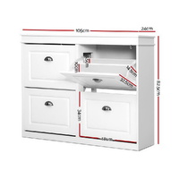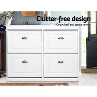 $150.29You are shoe proud. That is why you need ample space for all that wonderful footwear. Organise and save your floor space with our Shoe Cabinet and have a clutter-free entrance at all times. The four storage compartments are pull-down for easy access and have two tiers of adjustable shelves so that they can fit different footwear of various shapes and sizes. In fact, up to 16 of your favourite pairs would fit comfortably in it. Made of premium E1 MDF with smooth NC lacquer finish, the shoe cabinet is strong and durable to withstand daily robust use. Not least, its classic design, with beautiful retro-style metal cup pull handles, definitely lends a touch of elegance to any home.