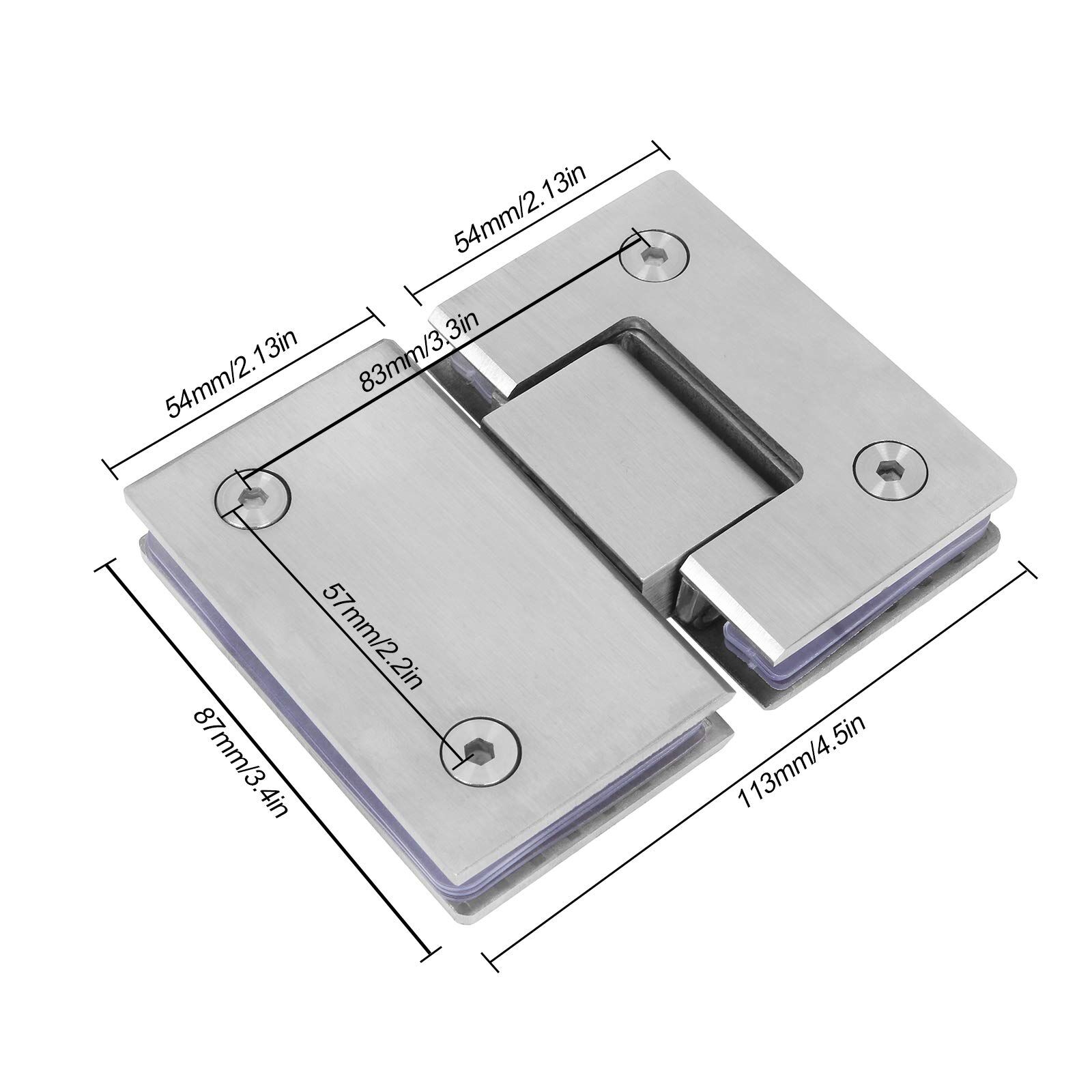 Premium Material: The door hinges are made of high-quality 304 stainless steel with satin nickel finishing. With 4mm thickness, the frameless glass door hinges can be sturdy and durable for years, ensuring long-time use without any deformation, scratch or abrasion.
