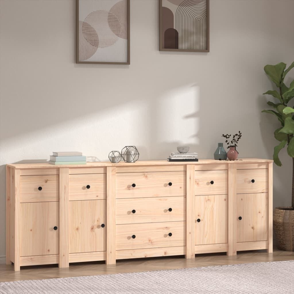 Store your precious things in a stylish way. This sideboard is ideal for every modern living room, bedroom or office to keep necessary items close at hand. Solid pine wood: Solid pine wood is a beautiful natural material. Pine wood has a straight grain, and the knots give the material its signature, rustic look.Ample storage: The cabinet provides ample storage space for keeping your various daily essentials well organised and within easy reach.Sturdy top: The sturdy top of the sideboard cabinet is ideal for displaying decorative objects, photo frames, or potted plants. Warning:In order to prevent overturning, this product must be used with the wall attachment device provided.Note:Each product comes with an assembly manual in the box for easy assembly.