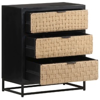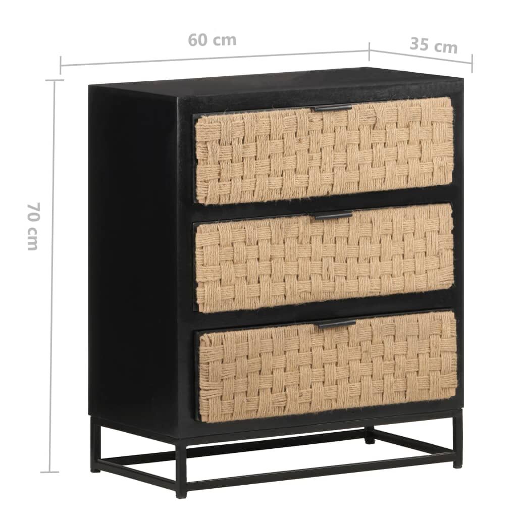 This wooden sideboard adds an industrial style to your living room. The side cabinet is made of solid mango wood, a tropical hardwood with the strength to bear the weight. It also stands the wear and tear of time, making it stable and durable. The drawer is made of natural jute and the iron base also adds extra stability. This storage cabinet features three drawers providing ample storage space. Important note: Colours and grains may vary from piece to piece, making each piece unique. The delivery is random, ensuring the exclusivity and individuality of your product.