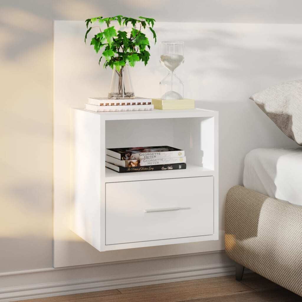 $56.66This wall bedside cabinet is the perfect solution for your living space to maximise space and keep the floor areas clean. Wall-mounted design: This floating bedside unit can be wall-mounted to add extra storage space. That way, you can maximise your floor space and keep the area clean.Multifunctional cabinet: The floating bedside cabinet serves as the ideal place to put items such as books, collectables, ornaments, and more. It can be combined with the bed headboard.Storage drawer: The spacious drawer allows you to keep your things organised.Easy-to-clean material: The engineered wood is of exceptional quality with smooth surface and also features strength, stability and resistance to moisture. Made of engineered wood, the wall hung bedside cabinet is easy-to-clean. WARNING:Screw(s) and plug(s) for inside the wall are not included. Seek and use screw(s) and plug(s) suitable for your walls. If you are uncertain, seek professional advice. Read and follow each step of the instruction carefully.
