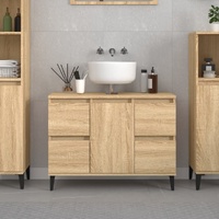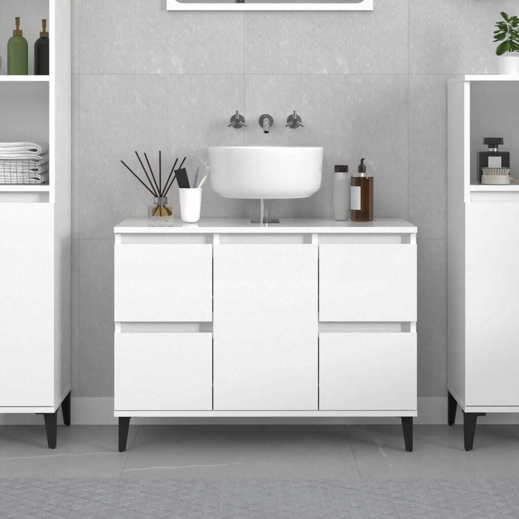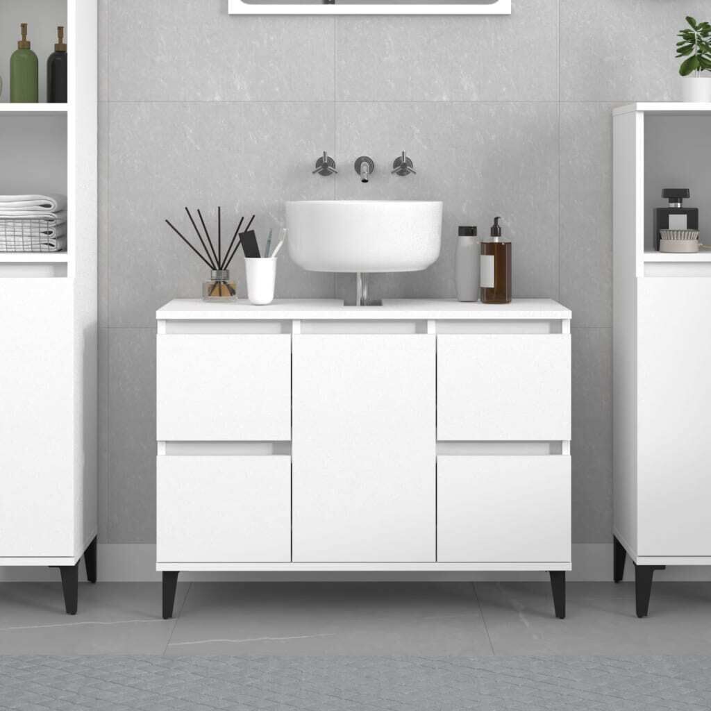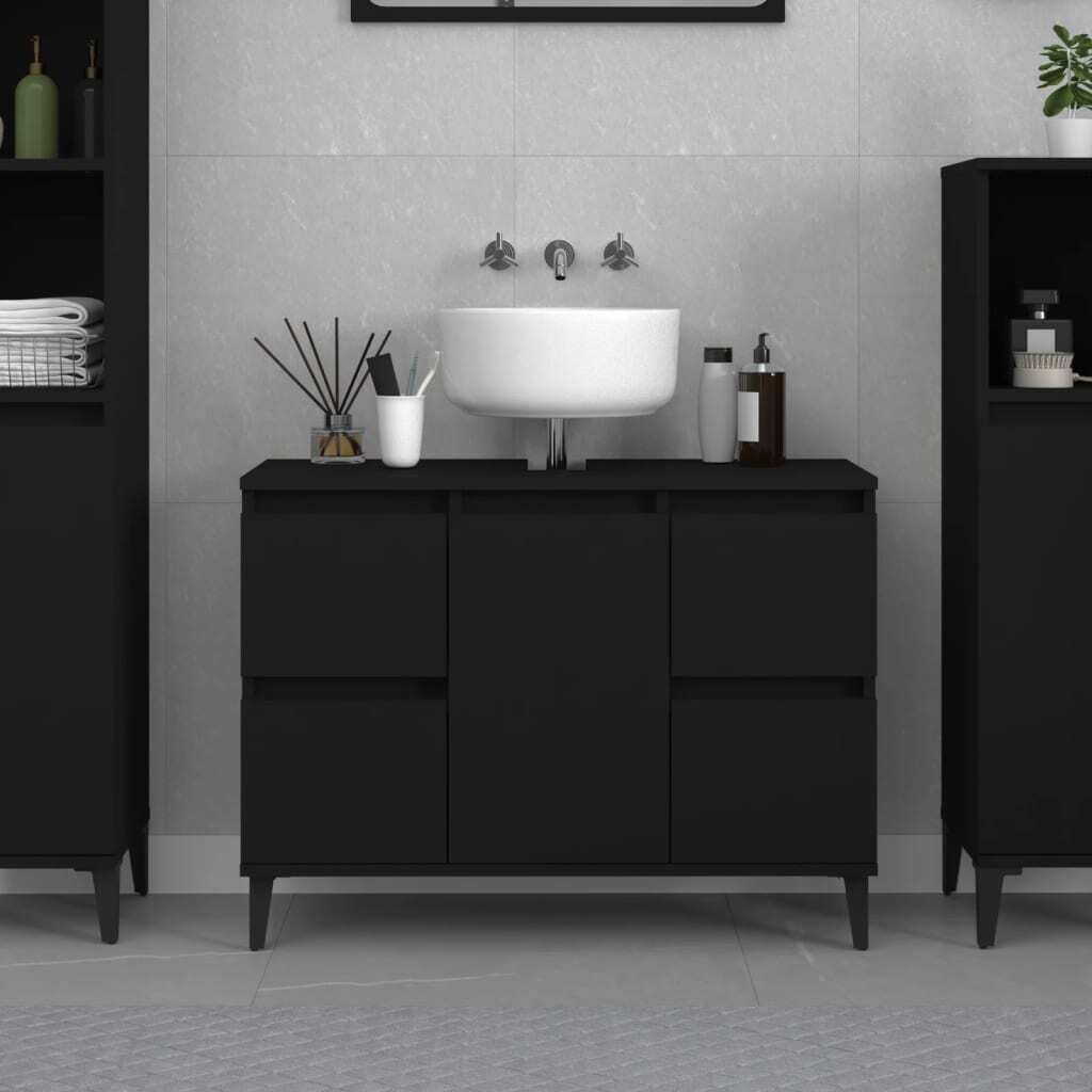 $130.49This sink cabinet is meant to be a great addition to your bathroom, giving it a tidy and striking appearance! Durable material: The engineered wood is of exceptional quality with smooth surface and also features strength, stability, and resistance to moisture.Ample storage space: The bathroom sink cabinet has 4 drawers and 1 compartment with a door, offering various storage options and extra space to store items in your bathroom. The top of the bathroom cabinet is ideal for placing the sink.Metal feet: The metal feet add a modern and calm style to your interior while ensuring stability.Easy-to-clean surface: The bathroom furniture is easy to clean with a damp cloth. Warning:To prevent it being overturned, this product must be used with the provided wall attachment device. Good to know:To make assembly as easy as possible, each product is delivered with a manual.The sink is not included.