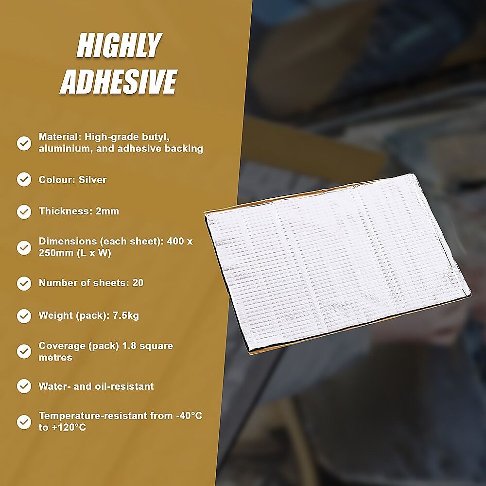 Its secret? A high-grade butyl compound embossed in a hex pattern with aluminium backing for easy cutting and better flexibility. It's light in weight, so you can give yourself a smoother, quieter drive without adding energy-draining weight and extra bulk. The hex shape moulds easily to a variety of surfaces, allowing you to install it almost on any part, no matter how convoluted the shape. It looks better than its competitors whilst delivering world-class performance. Don't put up with unwanted vehicle noise a day longer. Order your sound-deadening sheets today!