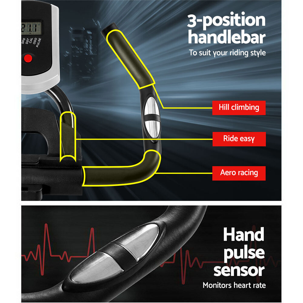 $263.69Now, nothing can stop your bike training regime. Not even bad weather. The Everfit Spin Bike helps to supplement your road biking sessions or lose some weight and get fit in the comfort of your home anytime. With a heavy-duty stainless steel 6kg flywheel and automotive-grade drive belt that delivers plenty of resistance via a control knob, the spin bike offers a smooth and noiseless workout. The frame itself is made of industrial-strength powder-coated steel for durable and robust use. Plus, an onboard computer with a LCD monitor assists in tracing six fitness parameters in one easy operation. The spin bike features an extra thick padded saddle seat that is fully adjustable in height and position. The handlebar is also adjustable to suit your handling comfort. Not least, the spin bike comes with non-slip feet pedals with straps and built-in transportation wheels for easy mobility.