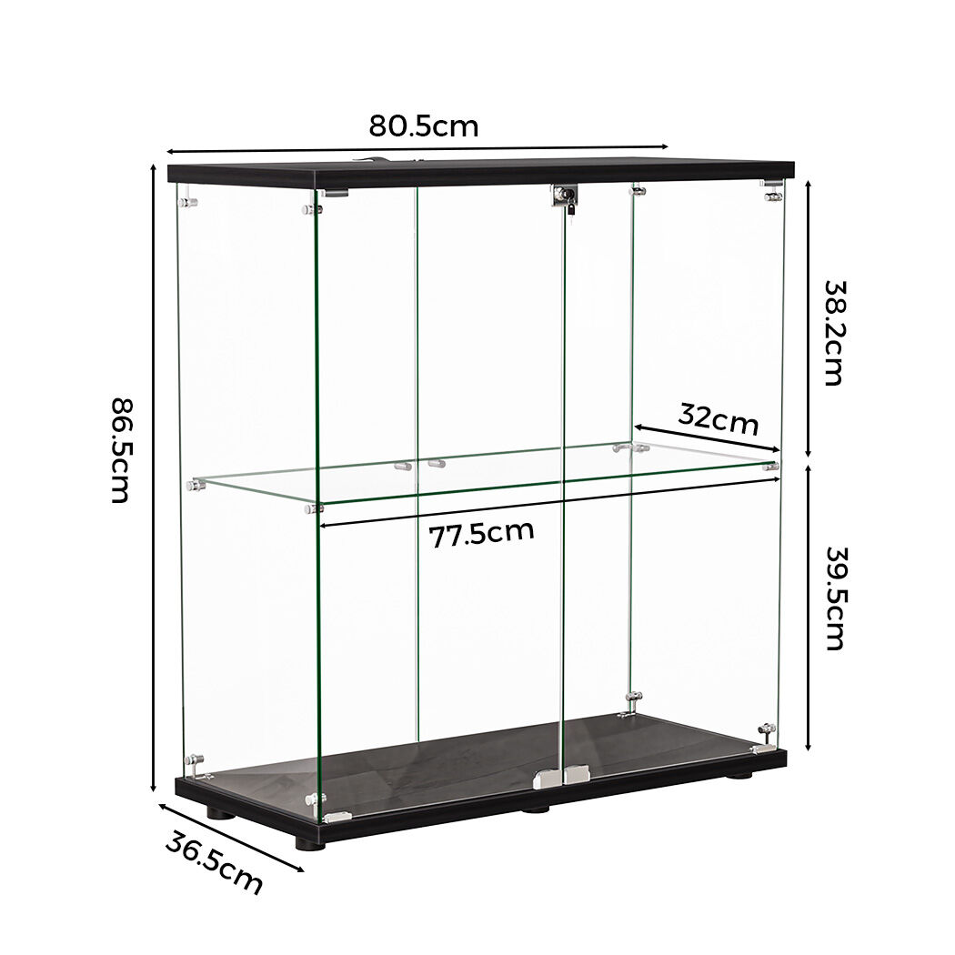 It features two tiers of tempered glass shelves for displaying collectibles, books, or decor. The clear glass gives it a sleek, modern look that fits any decor.