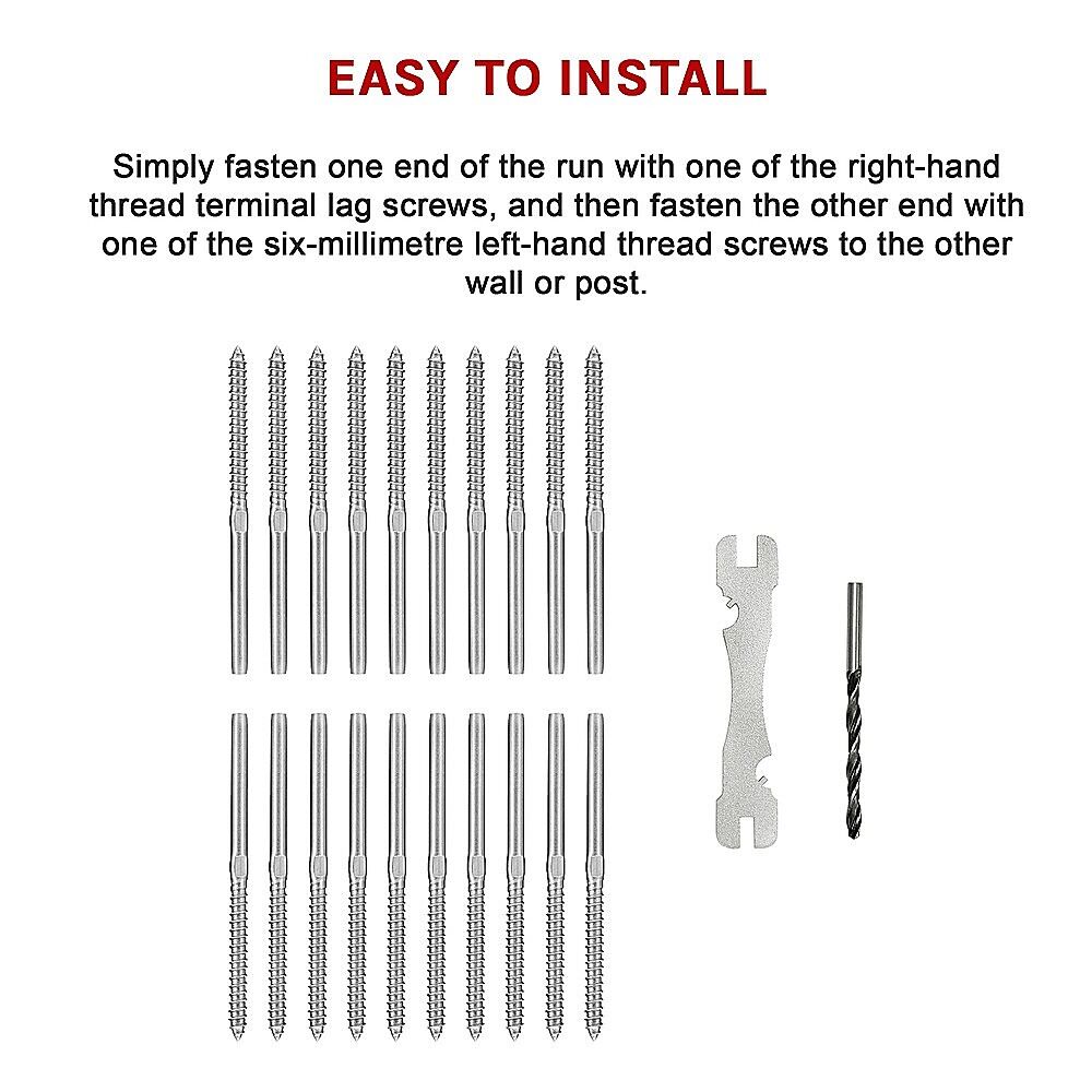 $32.39If you're planning to upgrade your residential or commercial property with a wire balustrade, these rugged, durable terminal lag screws by Randy Travis Machinery work equally well with both vertical and horizontal runs of balustrade or landscaping wire. This 20-piece set works with 3.2-millimetre wire up to 10 metres in length.