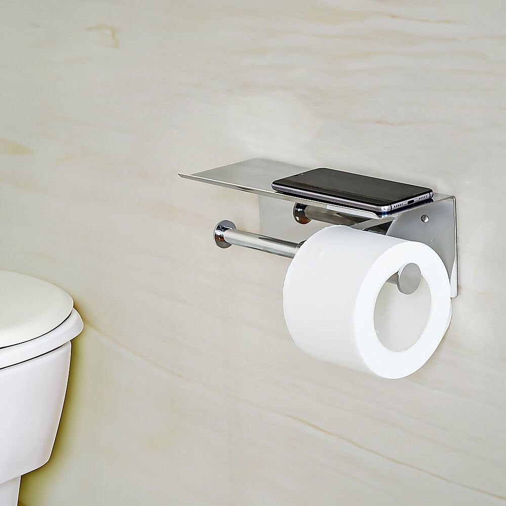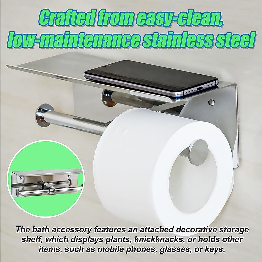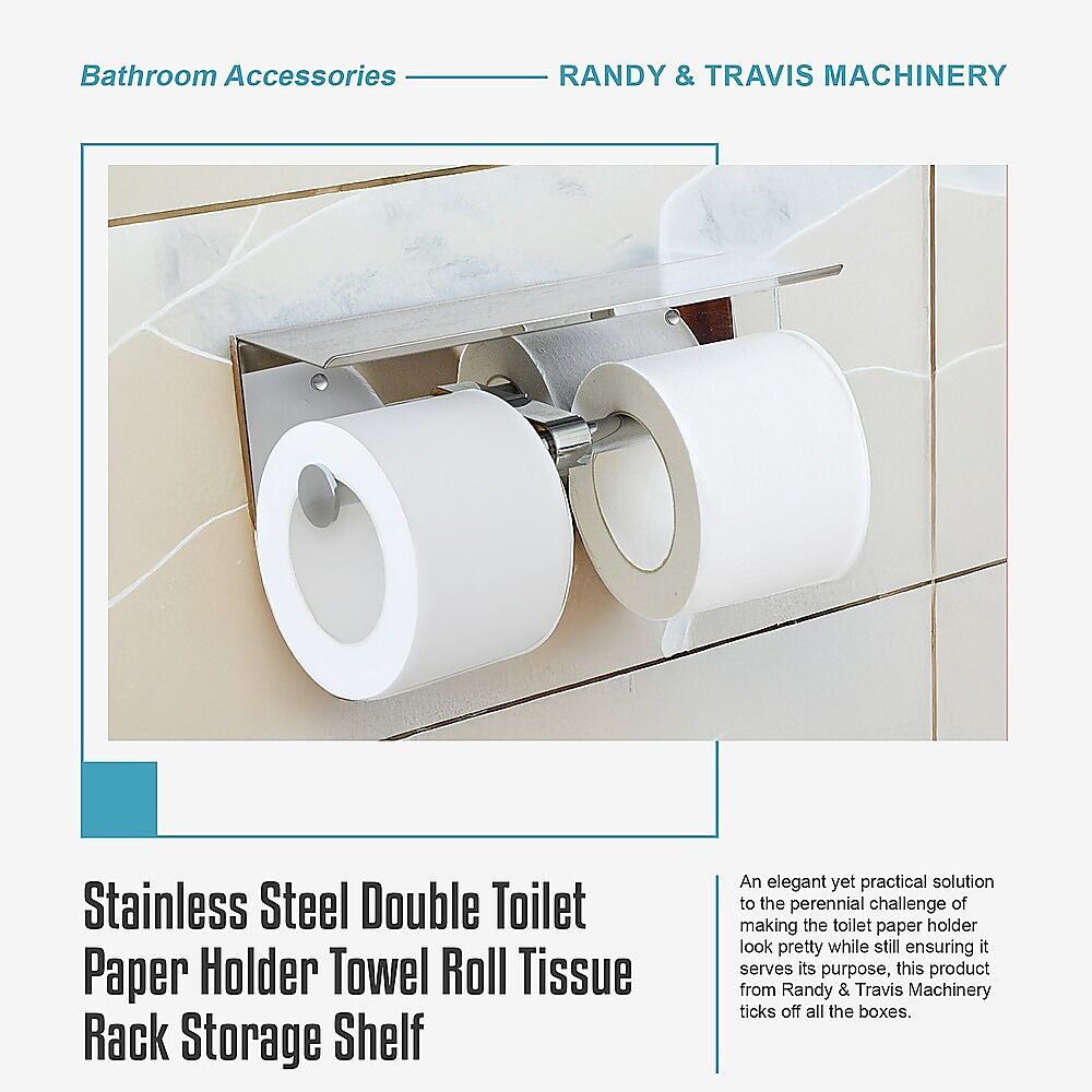 $52.19An elegant yet practical solution to the perennial challenge of making the toilet paper holder look pretty while still ensuring itserves its purpose, this product from Randy Travis Machinery ticks off all the boxes. Crafted from easy-clean, low-maintenance stainless steel, the bath accessory features an attached decorative storage shelf, which displays plants, knickknacks, or holds other items, such as mobile phones, glasses, or keys.