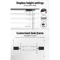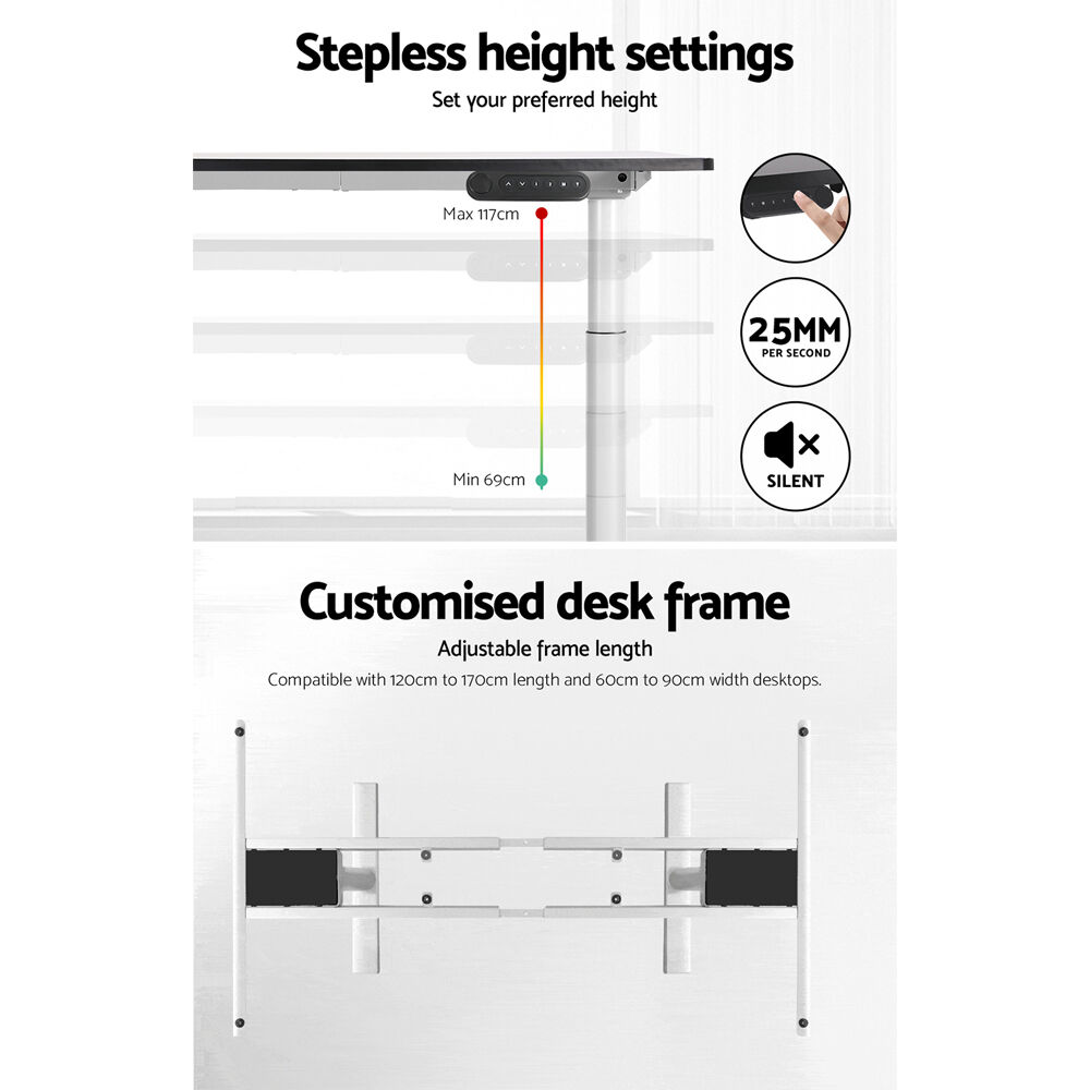 $310.49Poor posture and sedentary lifestyles contribute to several health issues. Now keep your health in good shape with Artiss motorised sit and stand desk frame! Its designed to go with our Artiss desktop and wont disappoint you either with its quality or aestheticsWith our innovative height-adjustable desk frame, you can stand while working and stretch and engage your muscles to prevent them from weakening. Our high-quality powder-coated desk frame makes cleaning and maintenance easy and ensures ultimate sturdiness. It features an easy-to-use digital control panel that enables you to easily adjust the desk to a suitable height and ensure your comfort while working. The smooth motors allow for ultra-quiet operation with low energy consumption. It also comes with adjustable rubber foot pads that offer extra stability and keep your floors safe. As for the desktop, it comes with pre-drilled holes for easy installation. It is made from eco-friendly particleboard and comes with a natural wood grain or contemporary matte finish to create a smooth surface and a beautiful aesthetic. The desktop is scratch resistant and perfect for all your working needs. Get yourself Artiss Motorised Adjustable Desk Frame and Desktop to prevent fatigue and improve productivity.
