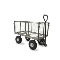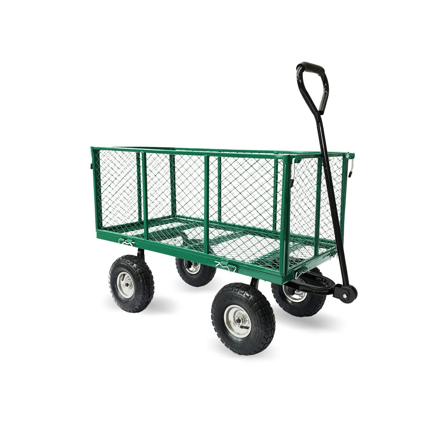 This heavy-duty garden cart makes landscaping jobs so much easier! It has a 300kg max loading capacity and 10-inch pneumatic tyres that can navigate your garden, yard and driveway with ease.This new and improved design features a larger cart with deep, 38cm sides to increase the loading capacity. It is perfect for hauling plants, rocks, soil, mulch, decorations and nursery supplies as well as other large items around your home.The heavy-gauge steel mesh sides can be folded down or removed, allowing you to use the cart as a flatbed trolley. Now you can easily haul wider loads such as tiles, slabs and pallets. The garden cart also uses rack and pinion steering, which means tight turns are no problem. And the padded handle is comfortable to pull, even when the cart is fully loaded.Simple to use and maintain, this garden cart is a great investment for both your home and garden!This unit is supplied unassembled. Easy assembly takes 60-75 minutes.