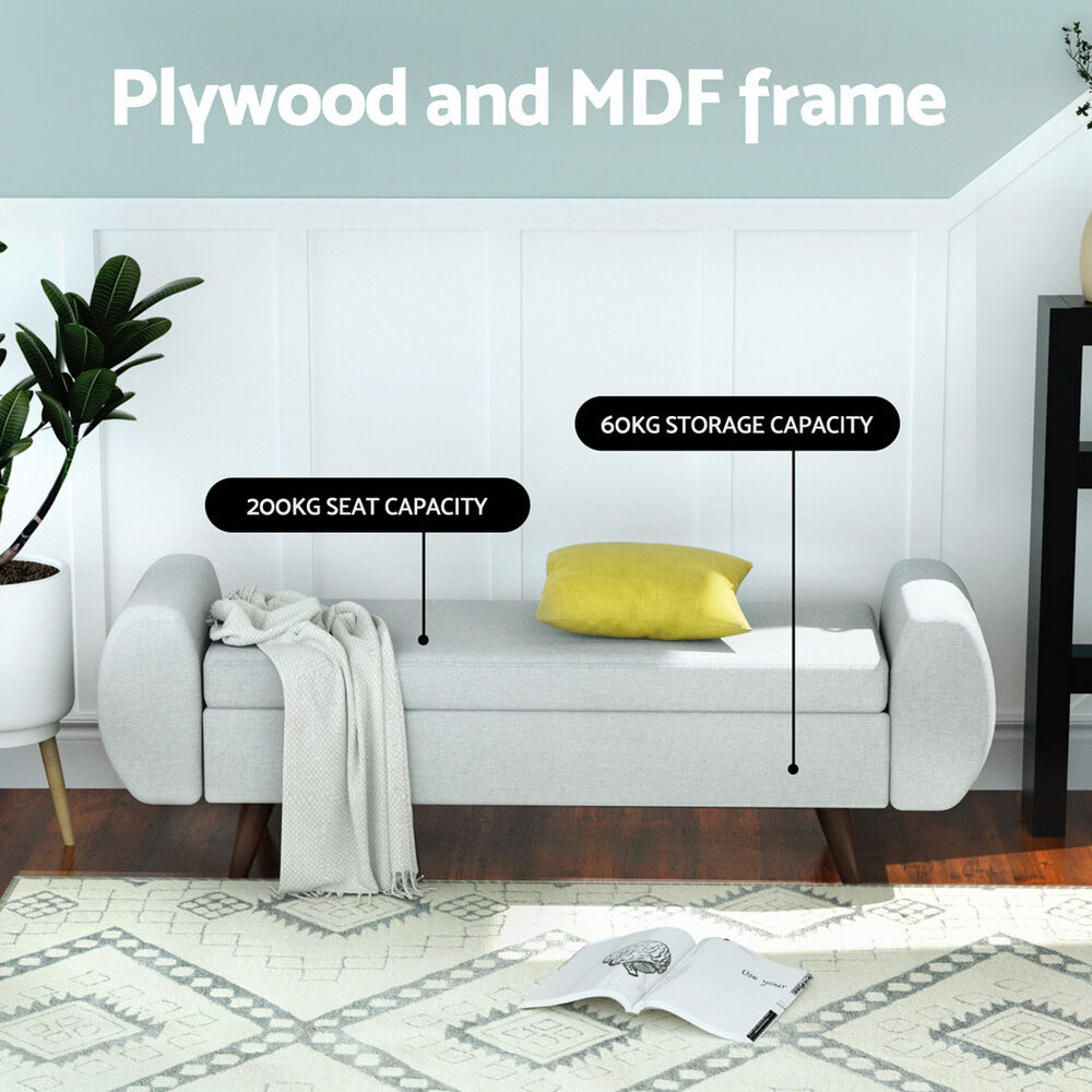 $144.89This Artiss storage ottoman features an armrest, faux linen upholstery, and a sturdy plywood and MDF frame. It boasts high-resilience foam padding, ample storage space, metal hinges, oak legs with plastic feet, and is simple to assemble.