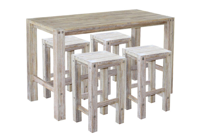 $1,147.61This Sturdy Bar Set includes a white brushed Eucalyptus bar table and matching stools. Designed for outdoor use with a fresh, elevated look for patios and decks.Add height and character to your space with our Sturdy Bar Table, crafted from robust non-FSC Acacia wood. Perfect for indoor or undercover outdoor settings, this elevated table offers a timeless, rustic charm. Thanks to its minimalist structure and durable construction, it pairs beautifully with bar stools for casual meals, drinks, or entertaining guests. The natural grain and distressed finish add warmth and texture to any décor. Ideal for cafes, patios, and entertainment areas, this bar table blends functionality with earthy elegance. Measurements: Table:150 x 80 x 110cm and Stool 32 x 42 x 75 cm (Approximately).