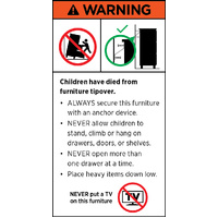 Tip-over incidents can cause serious injury or death. Always install the supplied wall-anchoring device (or an appropriate anchor for your wall type) and follow the instructions. Never allow children to climb, stand, or hang on drawers, doors, or shelves. Store heavier items on lower shelves; keep the top light and uncluttered. Place on a level surface and check anchors regularly.
