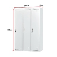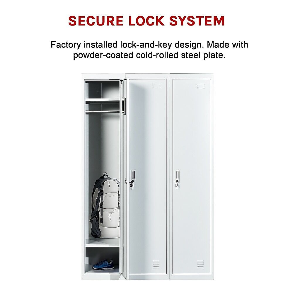 The locker is constructed with solid cold-rolled steel plate for excellent sturdiness and durability, not to mention an attractive look. The steel is also powder-coated to resist corrosion. The locker measures 180 x 114 x 45 cm, and the maximum recommended weight capacity is approximately 30kg per locker. Privacy and security are assured with a simple lock and key design. There are spaces designated for labels to help identify lockers, and air vents are built-in to assure sufficient ventilation. Each lock comes with 2 keys.