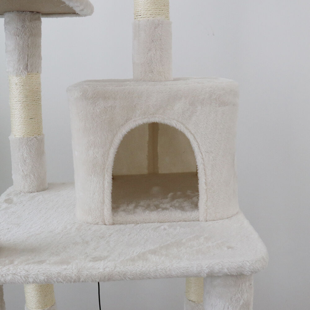 This cat tree has all your kittys needs covered by providing cozy spots to relax in, hideouts to retreat to at their leisure, scratching and perching opportunities, and playtime fun.