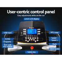 $660.59Compact and sturdy with its powder-coated steel frame, the Everfit Electric Treadmill allows you to perform essential cardio exercises within the comfort of your home. It features 12 pre-set training programs designed to simulate natural terrain. A user-centric control panel with a digital LCD display lets you set up to 18 speed levels and other monitoring parameters. Its linear power drive motor produces smooth and seamless operation and the anti-slip belt and soft-grip handle bar with pulse sensors make your session a comfortable and controlled experience. Other great features include a 15-level inclination adjustment, innovative double shock absorption system, automatic motor and belt lubrication, safety tether key and smooth wheels for easy mobility. Not least, the electric treadmill is also equipped with a USB and MP3 connection, dual speakers, dual drink holders and a tablet holder for those who like to work out in style.