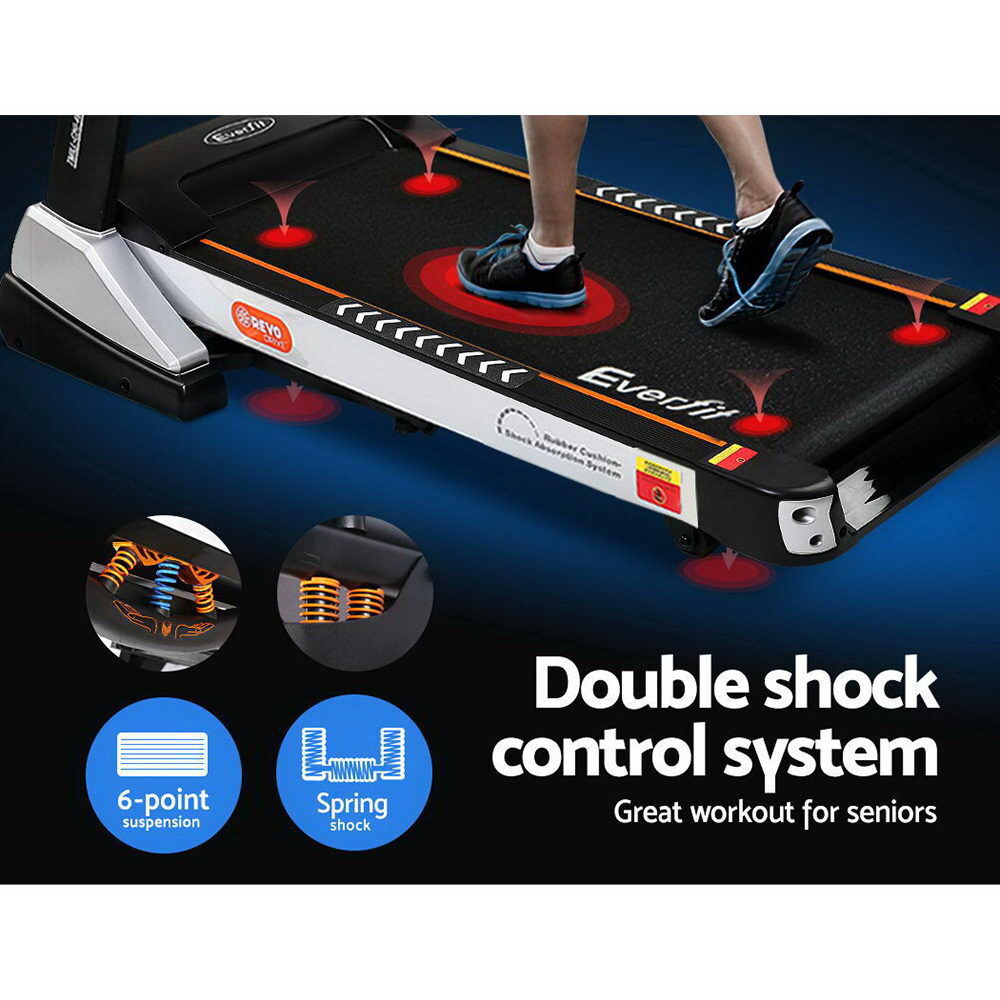 NOW $682.57Compact and sturdy with its powder-coated steel frame, the Everfit Electric Treadmill allows you to perform essential cardio exercises within the comfort of your home. It features 12 pre-set training programs designed to simulate natural terrain. A user-centric control panel with a digital LCD display lets you set up to 18 speed levels and other monitoring parameters. Its linear power drive motor produces smooth and seamless operation and the anti-slip belt and soft-grip handle bar with pulse sensors make your session a comfortable and controlled experience. Other great features include a 15-level inclination adjustment, innovative double shock absorption system, automatic motor and belt lubrication, safety tether key and smooth wheels for easy mobility. Not least, the electric treadmill is also equipped with a USB and MP3 connection, dual speakers, dual drink holders and a tablet holder for those who like to work out in style.