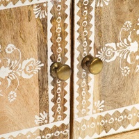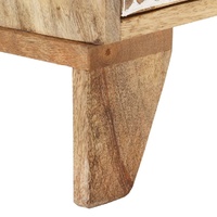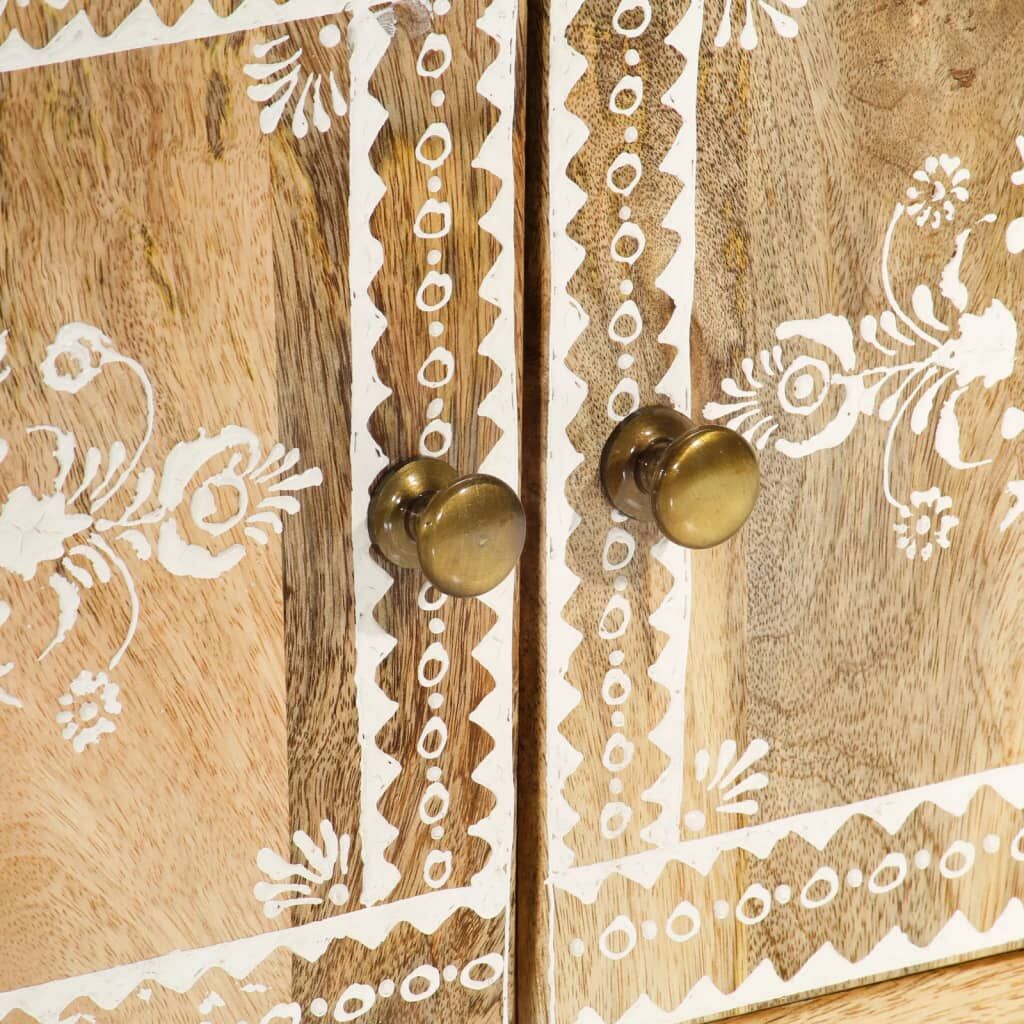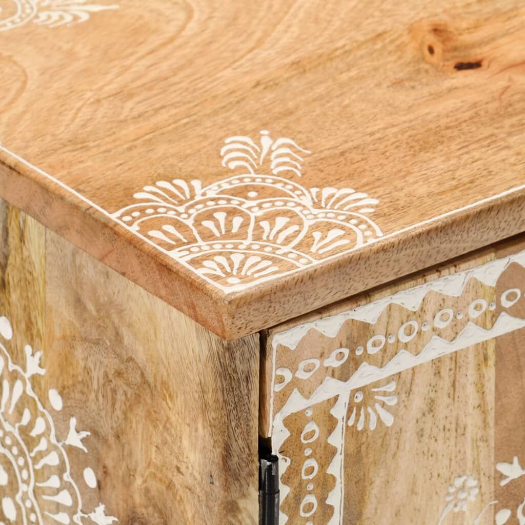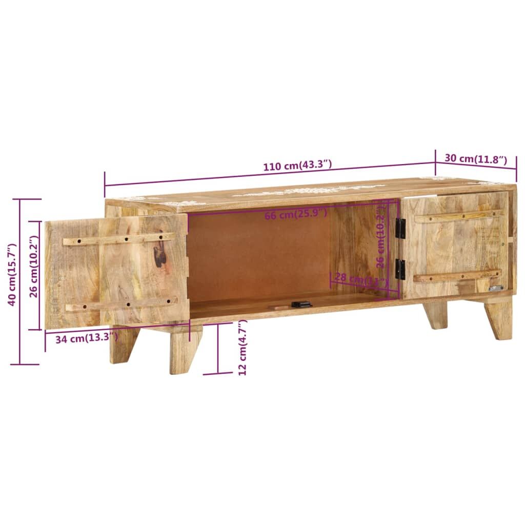 $242.68This solid mango wood TV stand is a perfect match for your TV and will keep your media appliances and carriers neatly organised. Solid mango wood: This TV stand is made of solid mango wood, a hardwood with dense grains. Solid mango wood not only has the strength to bear the weight but also stands the wear and tear of time. Spacious storage: The three compartments of this TV unit provide ample spaces for you to keep your DVD player, game console, streaming device and media carriers neatly organised. Gorgeous painting patterns: The handpainted decorative patterns of this media cabinet will add a unique touch of style to your living area. Practical doors: Keep your space clutter-free by hiding small essentials behind the doors of this media unit.Wooden feet: The wooden feet of this HiFi cabinet give the product a natural and pleasant look while ensuring stability. It can blend well with any interior decor. Note:The colours may vary from piece to piece, making each piece unique and slightly different from the next. The delivery is random, ensuring the exclusivity and individuality of your product.Each product comes with an assembly manual in the box for easy assembly.