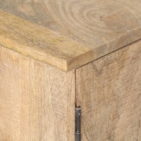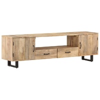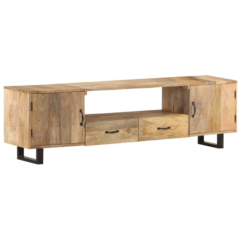 $236.69This trendy wooden TV cabinet with a large storage room is meant to be the focal point of your living room, hall or entertainment area. This lowboard is made of solid mango wood, a tropical hardwood with the strength to bear the weight and stand the wear and tear of time. The exquisite craftsmanship and beautiful wood grains make every piece slightly different from the next. The stereo cabinet features 2 doors, 2 drawers and an open compartment with large storage space for keeping your DVDs, multimedia appliances, books and small essential items organised and within reach. Additionally, the strong powder-coated steel legs add to its sturdiness. Important note: The colours vary from piece to piece, making each piece unique. The delivery is random, ensuring the exclusivity and individuality of your product.