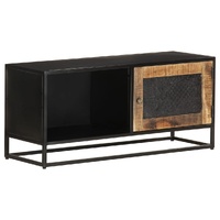 $187.85This wooden TV cabinet has an industrial style and makes it a perfect choice for your interior living space. The stereo cabinet is made of rough mango wood, a tropical hardwood with the strength to bear the weight. It also stands the wear and tear of time, making it stable and durable. The powder-coated iron frame also adds extra stability. The media unit also features a door with hand carved pattern and a compartment providing ample storage space. Additionally, the sturdy top can be used to display decorative objects such as photo frames, potted plants, vases, etc. Important note: Colours and grains vary from piece to piece, making each piece unique. The delivery is random, ensuring the exclusivity and individuality of your product.