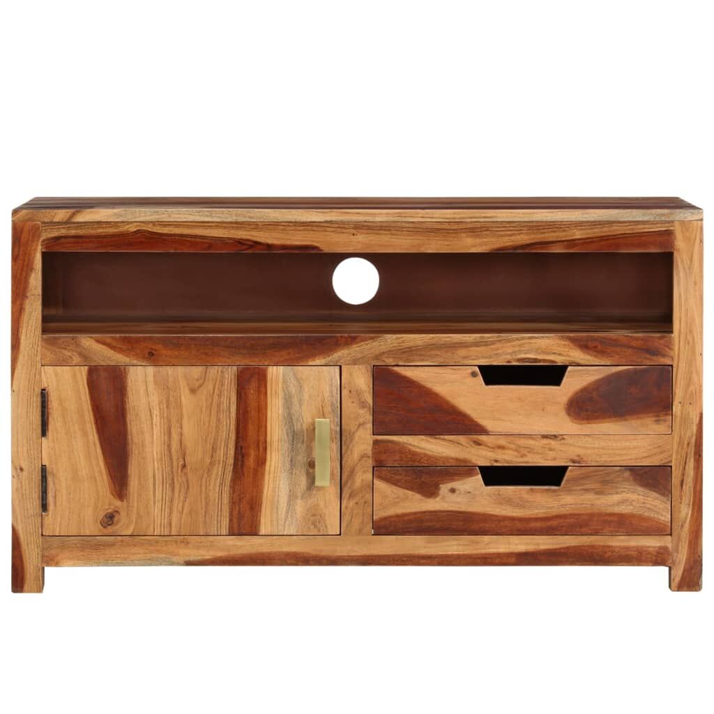 $210.13This stylish wooden TV cabinet with a unique design will make a timeless addition to your living room or entertainment area. It can be used as a TV stand, hifi cabinet, or lowboard. Premium material: Solid acacia wood is a beautiful natural material. Treat the surface with oil, wax, lacquer, or a glazing finish for a stronger surface and easy cleaning. Acacia wood is a tropical hardwood, which is dense, sturdy, and durable.Decorating function: The beautiful wood grains make each of our TV cabinets unique and slightly different from the others. Storing function: This TV stand with 1 door, 1 shelf and 2 drawers provides ample space for keeping your DVD player, game console, streaming device, media carriers, etc. neatly organised.