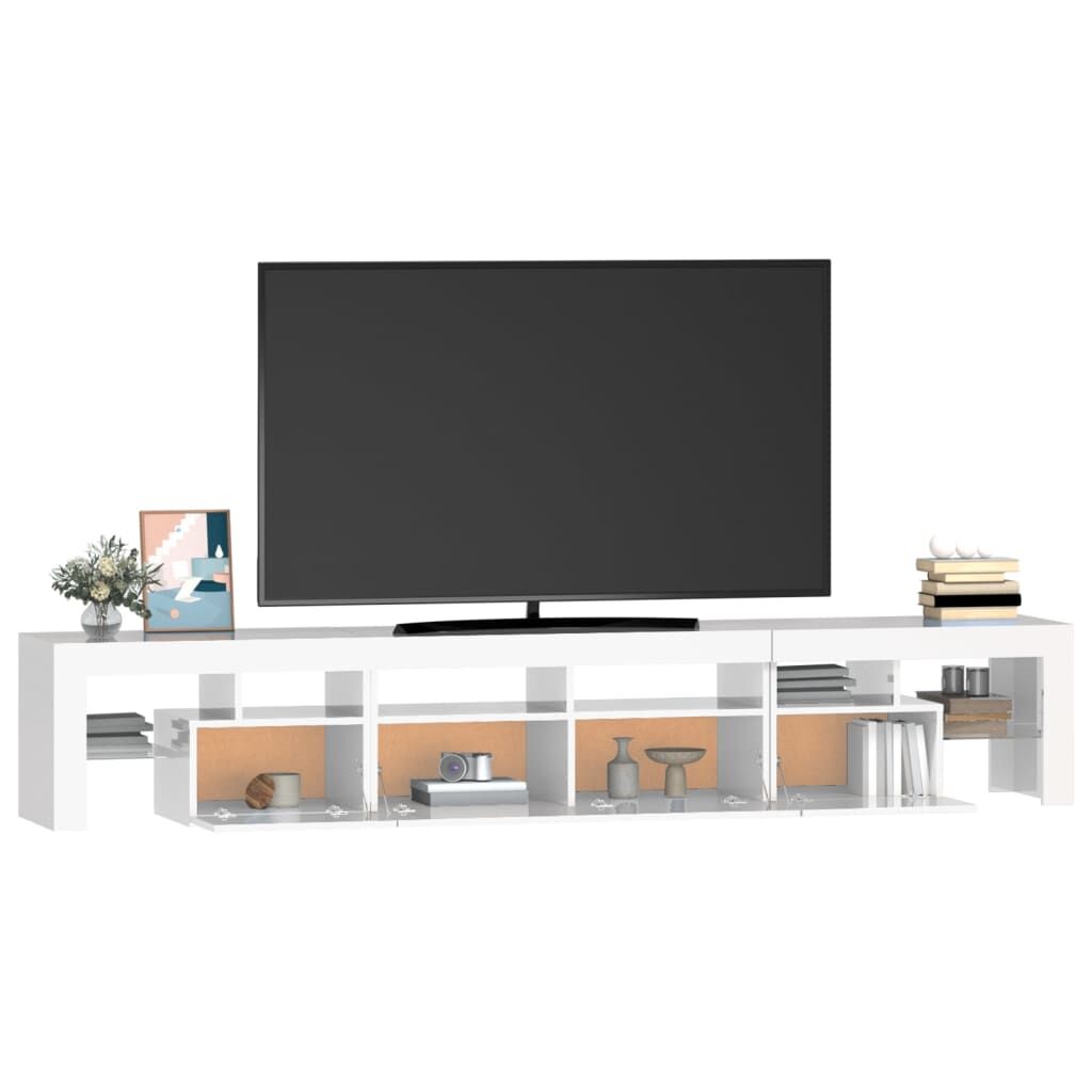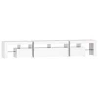 Featuring a trendy yet practical design, this TV cabinet with LED lights definitely becomes a focal point of your room. Practical material: The engineered wood is of exceptional quality with smooth surface and also features strength, stability and resistance to moisture. Colourful LED lights: The TV stand features RGB LED lights, which has different menus to change the colour of lights and let the colour adjust automatically differently. The LED lights underline the modern look and contribute to the trendy feeling.Ample storage space: The TV unit provides plenty of storage space for keeping your magazines, books, remote controls and other small items well-organised and within easy reach.Displaying function: The sturdy top of media cabinet is ideal for displaying decorative objects, photo frames, or potted plants. Note:The product has a USB connector, but the certified 5V USB power source is not included.Each product comes with an assembly manual in the box for easy assembly.