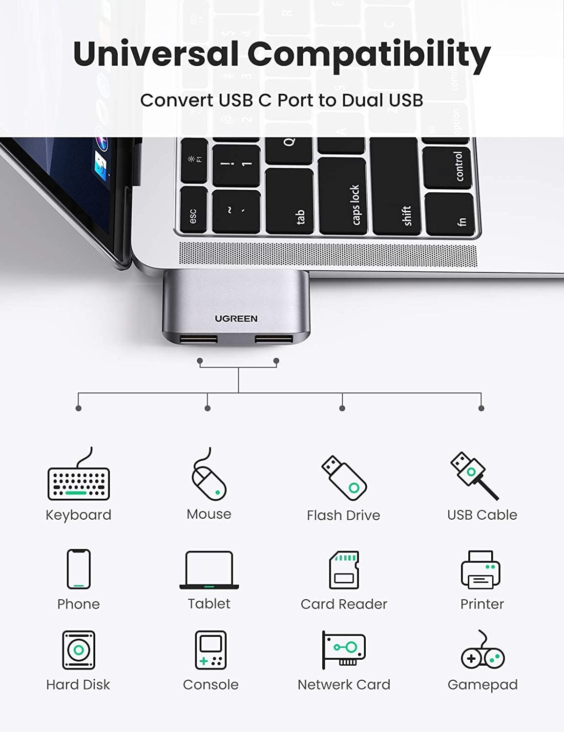 The USB C Adapter supports the transfer of movies and music within a few seconds at a transmission speed of 5 Gbps. It satisfies your wireless mouse/keyboard receiver, U disk, mobile phone, or hard disk to run efficiently through 2 USB 3.0.