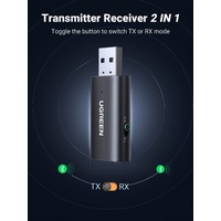 UGREEN 3.5mm Bluetooth Transmitter for TV supports both Bluetooth transmitting and receiving, namely TX and RX Mode. RX mode supports two devices to use simultaneously like car stereo, and home stereo, while TX mode supports one device to use simultaneously like TV, PC.