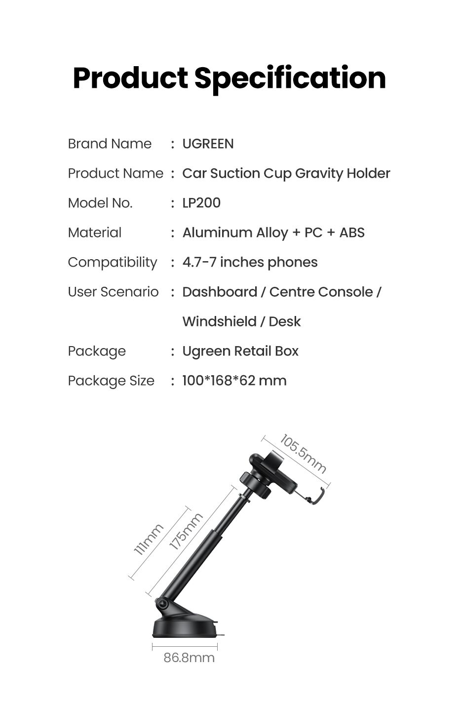UGREEN 60990 Gravity Phone Holder with Suction Cup (Black)