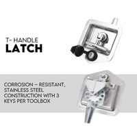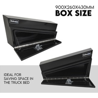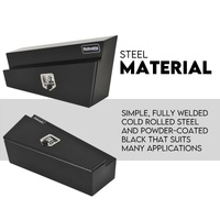 Similar to its flat plate under tray toolbox and plate aluminium flat counterpart, it is built with super-heavy duty steel. Secure this black powder coated toolbox on the underbody of your truck or UTE for maximum strength and secure extra storage space.