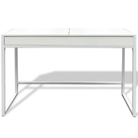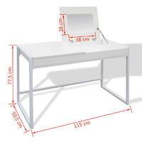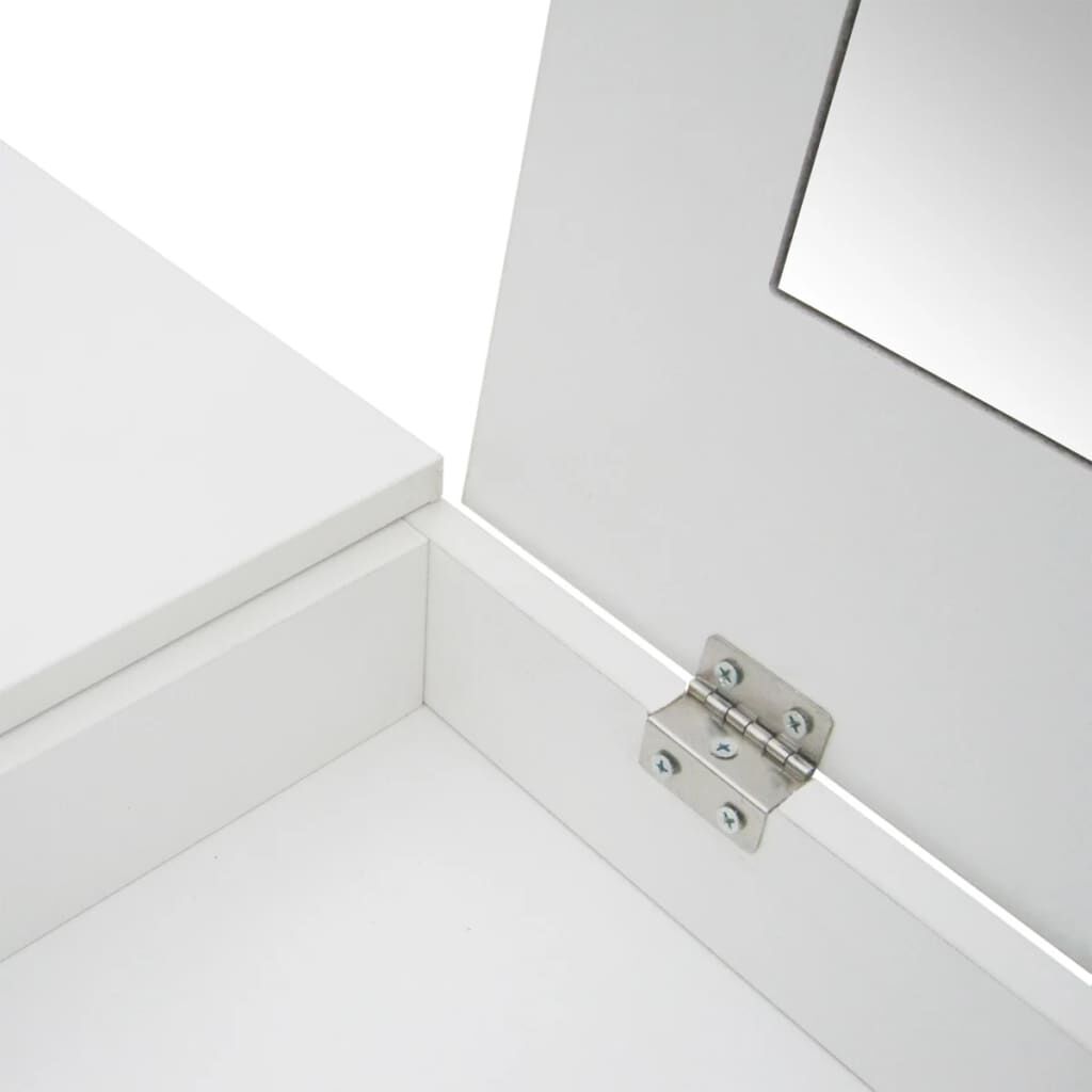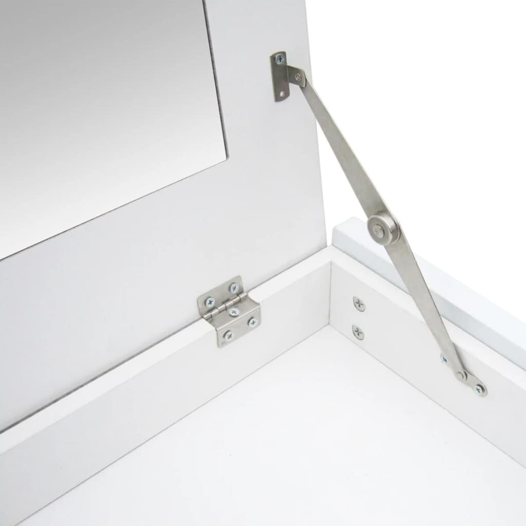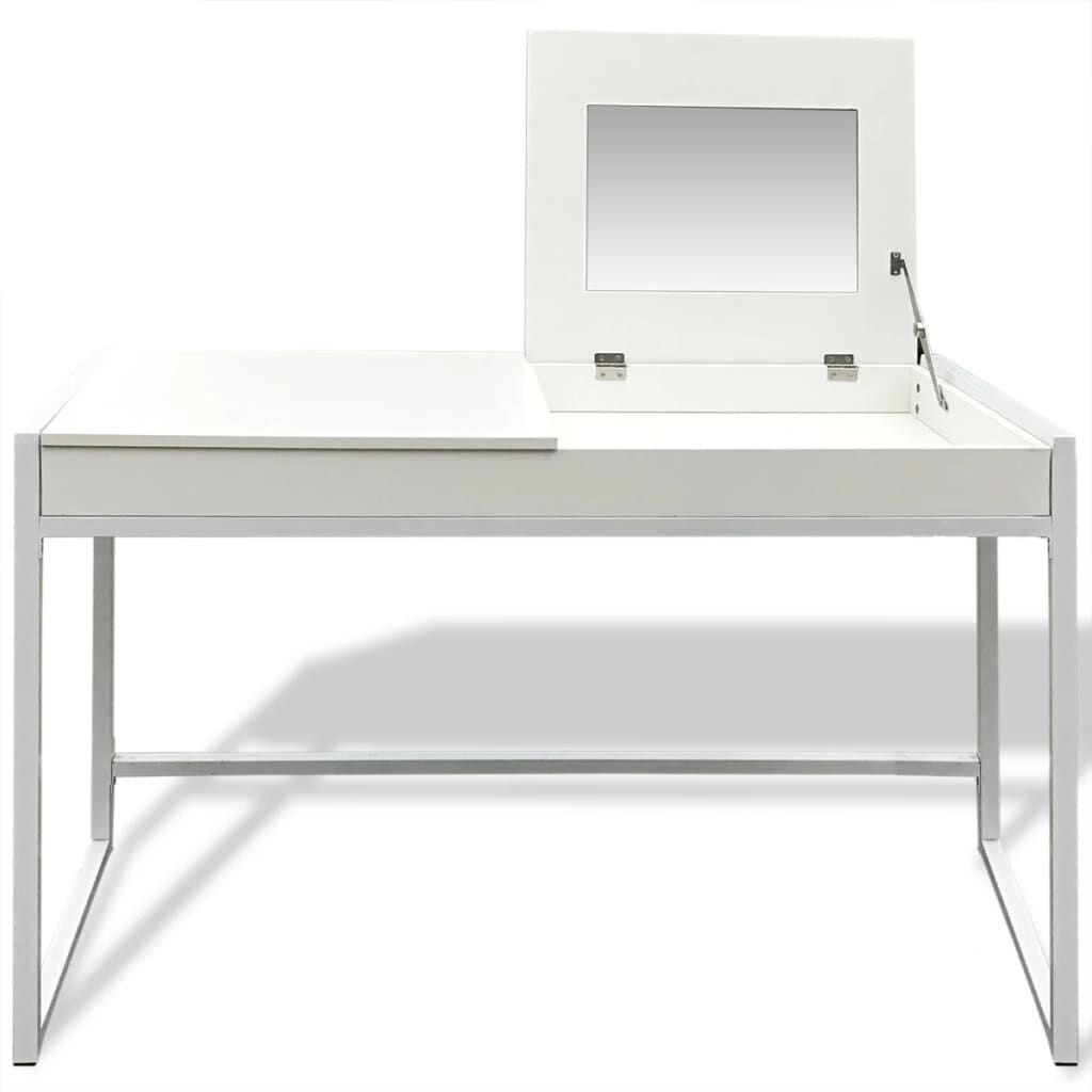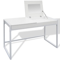 $159.95This vanity table is made of high-quality wood. Thanks to its chic design and clean white finish, it will add a touch of elegance to your bedroom or changing room. The dressing table has been expertly crafted. It has 2 spacious jewelry compartments with flip-up tops, which offer plenty of room for your cosmetics, hair products and skincare items. The right compartment has a mirror underneath the top. When the mirror is not in use, the tabletop becomes an ideal place for an array of makeup, jewelry and beauty supplies. This vanity table will become the focal point of any room!