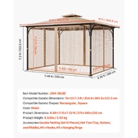 This replacement gazebo netting measures 8.99 (L) x 11.15 (W) x 7.22 (H) ft / 275 x 340 x 220 cm, and is compatible with most 10ft (L) x 12ft (W) x 7.3 ft (H) / 304.8 x 365.8 x 222.5 cm rectangular or square gazebos, including straight-leg canopies, pop-up tents, pavilions, and wrought-iron tents. The net includes four zippered mesh side panels that cover all four sides of the gazebo. Please measure your gazebo before purchase.