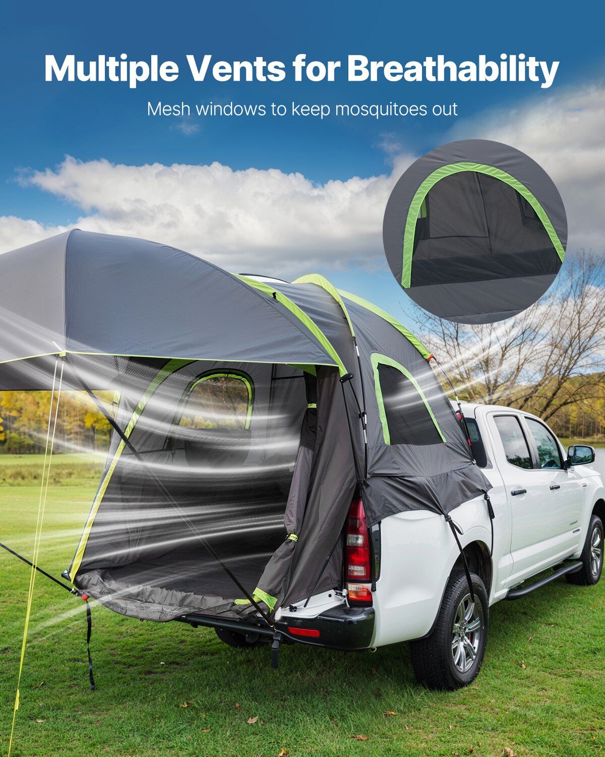 The tent for truck bed is equipped with side windows and doors for excellent visibility and airflow, with mesh screens to keep pesky mosquitoes out while you enjoy the fresh air.
