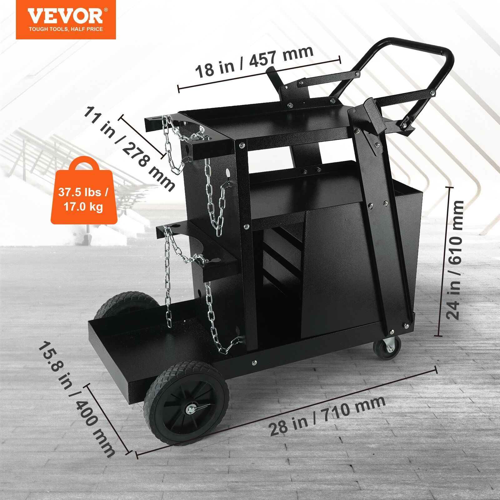 Large 2-tier MIG welder cart can effortlessly accommodate welding caps, welding machines, gas cylinders, welding guns, tools, and more, with 4 practical drawers for neat and organized storage of your items. 2 multi-functional brackets on the sides can hold welding guns, welding pliers, and other tools. Keep your welding tool within arm's reach and well tidy your space with VEVOR.