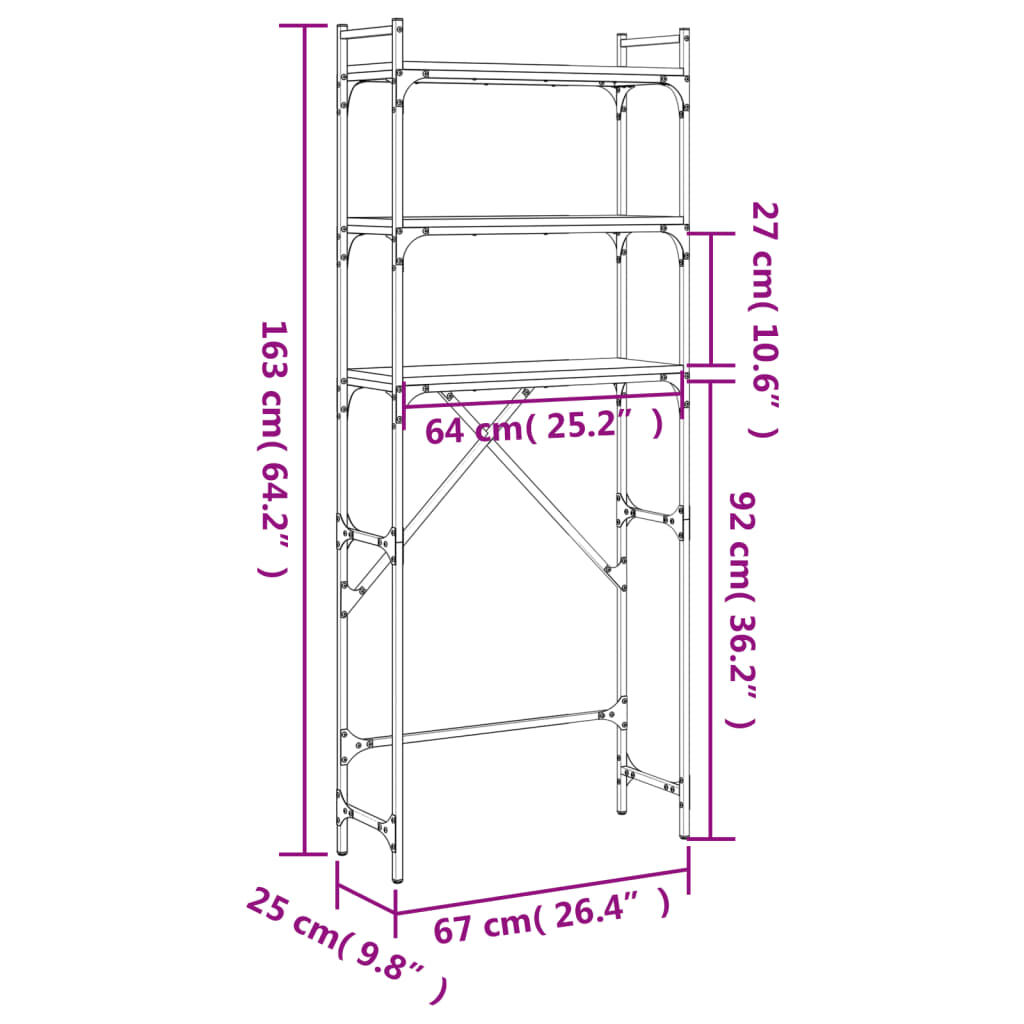 $100.79This 3-tier washing machine shelf is a perfect solution to create extra storage spaces for an overcrowded bathroom or laundry room. Durable material: The engineered wood is of exceptional quality with smooth surface and also features strength, stability and resistance to moisture. Made of engineered wood, the bathroom shelf is easy to clean.Ample storage space: The bathroom storage features 3 shelves, offering ample space to easily hold your essential cleaning supplies such as soap, laundry detergent, fabric softener, and more.Space-saving design: The bathroom organiser is designed to be placed above the washing machine or toilet, fitting well in small spaces and making it ideal for small bathrooms and laundry rooms.Adjustable feet: The adjustable feet with plastic pads keep the toilet stand balanced on uneven ground and increase stability.Metal frame: The metal frame adds an industrial style to your interior while ensuring durability and stability. Warning:To prevent it being overturned, this product must be used with the provided wall attachment device. Good to know:Screws and plugs for inside the wall are not included. We advise to find and use screws and plugs suitable specifically for your walls. If you're not sure, you can consult with a professional. Please read and follow each step of the instructions.
