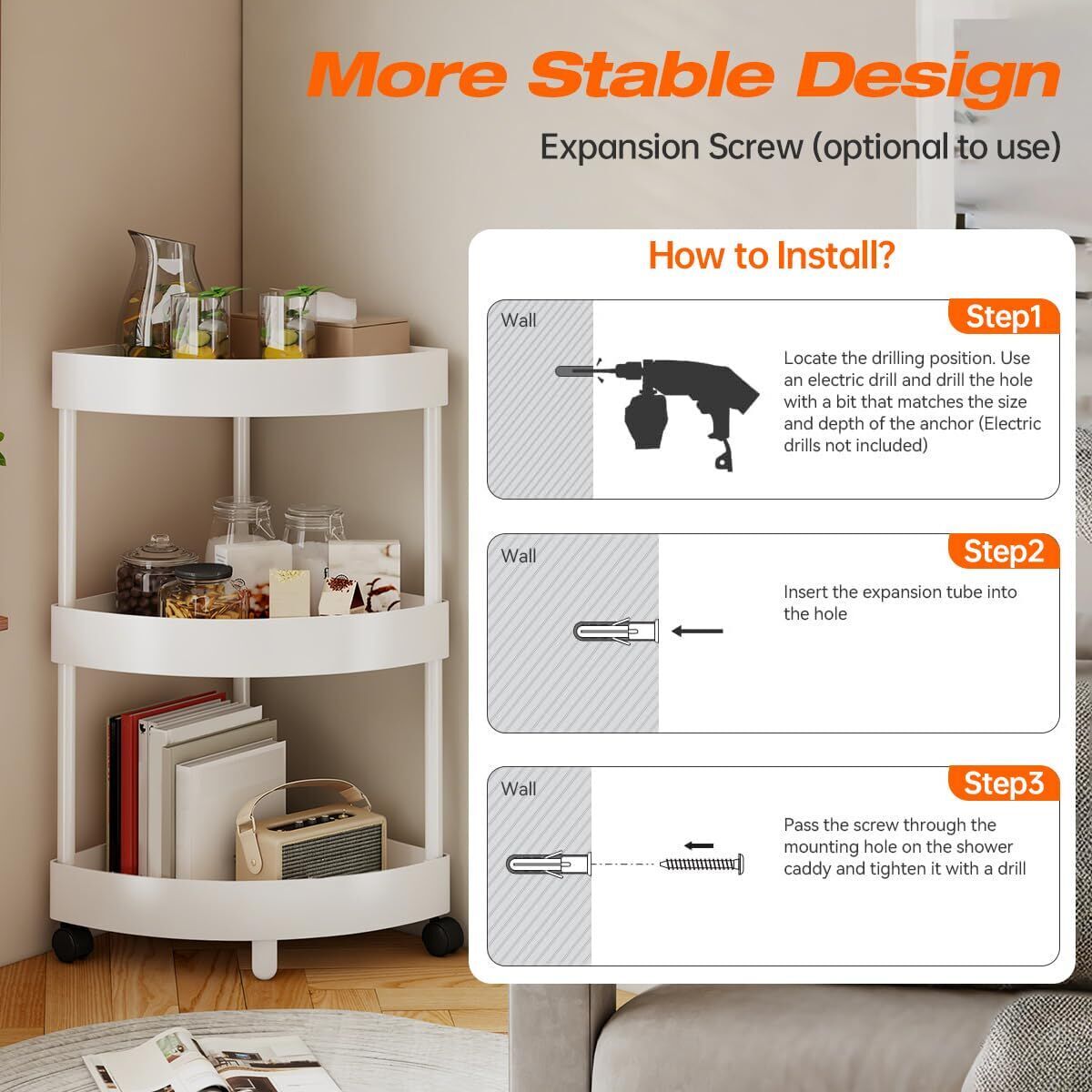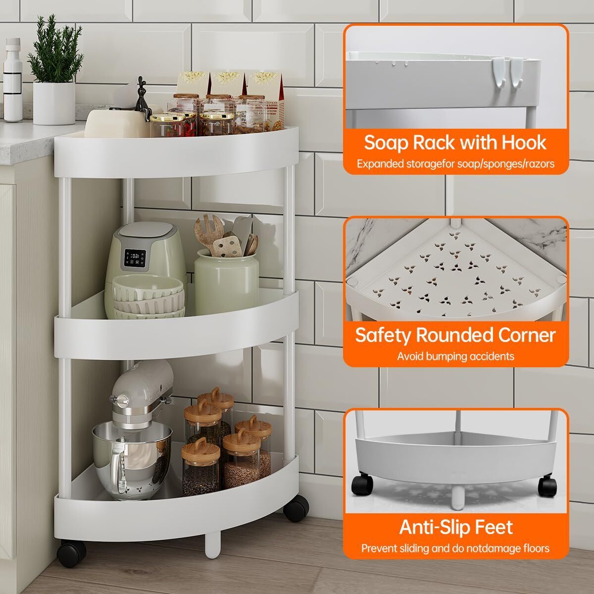 Maximize every inch of your home with this versatile 3-tier corner storage shelfengineered to turn awkward angles into smart, functional space. Its sleek triangular design fits perfectly into 90 corners, making it ideal for bathrooms, kitchens, laundry rooms, bedrooms, or even garages. Whether youre organizing toiletries, spices, cleaning supplies, books, or office essentials, this rolling shelf delivers practicality without compromising on style.
