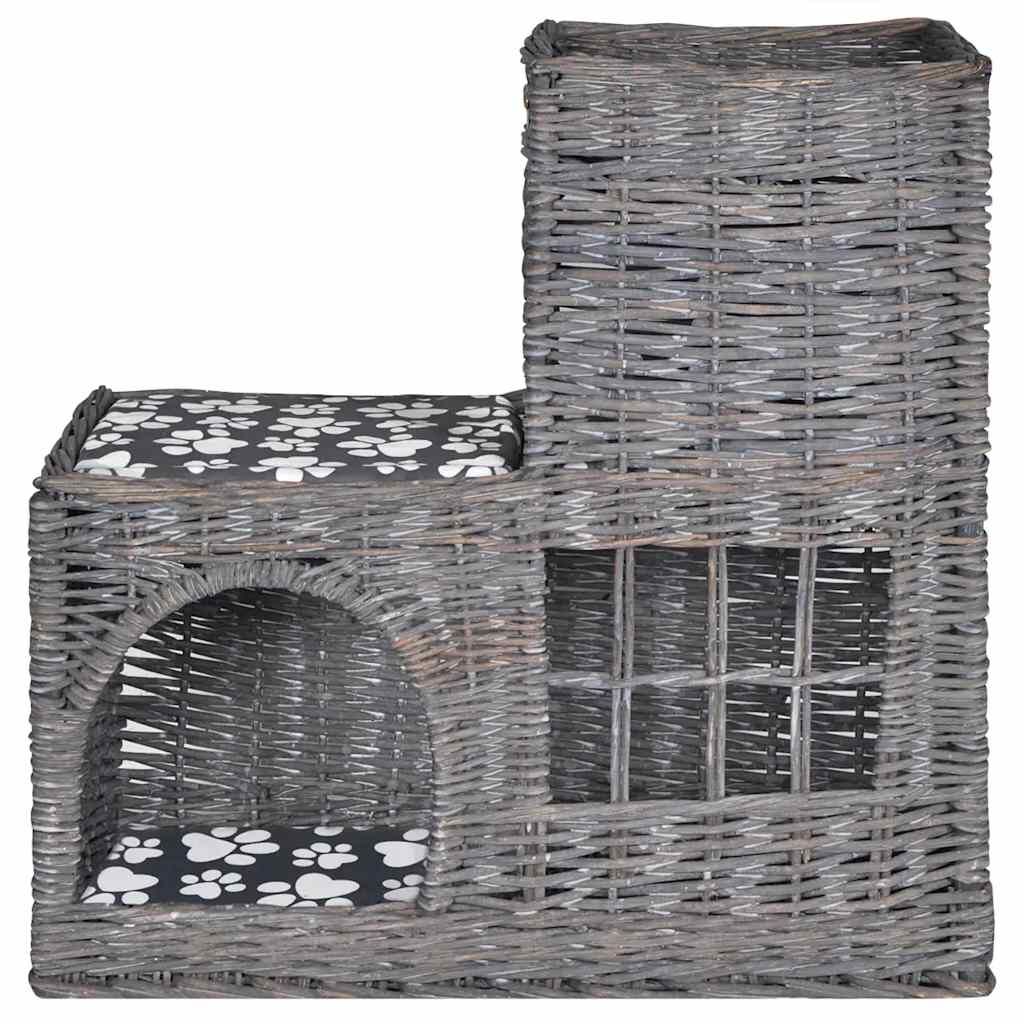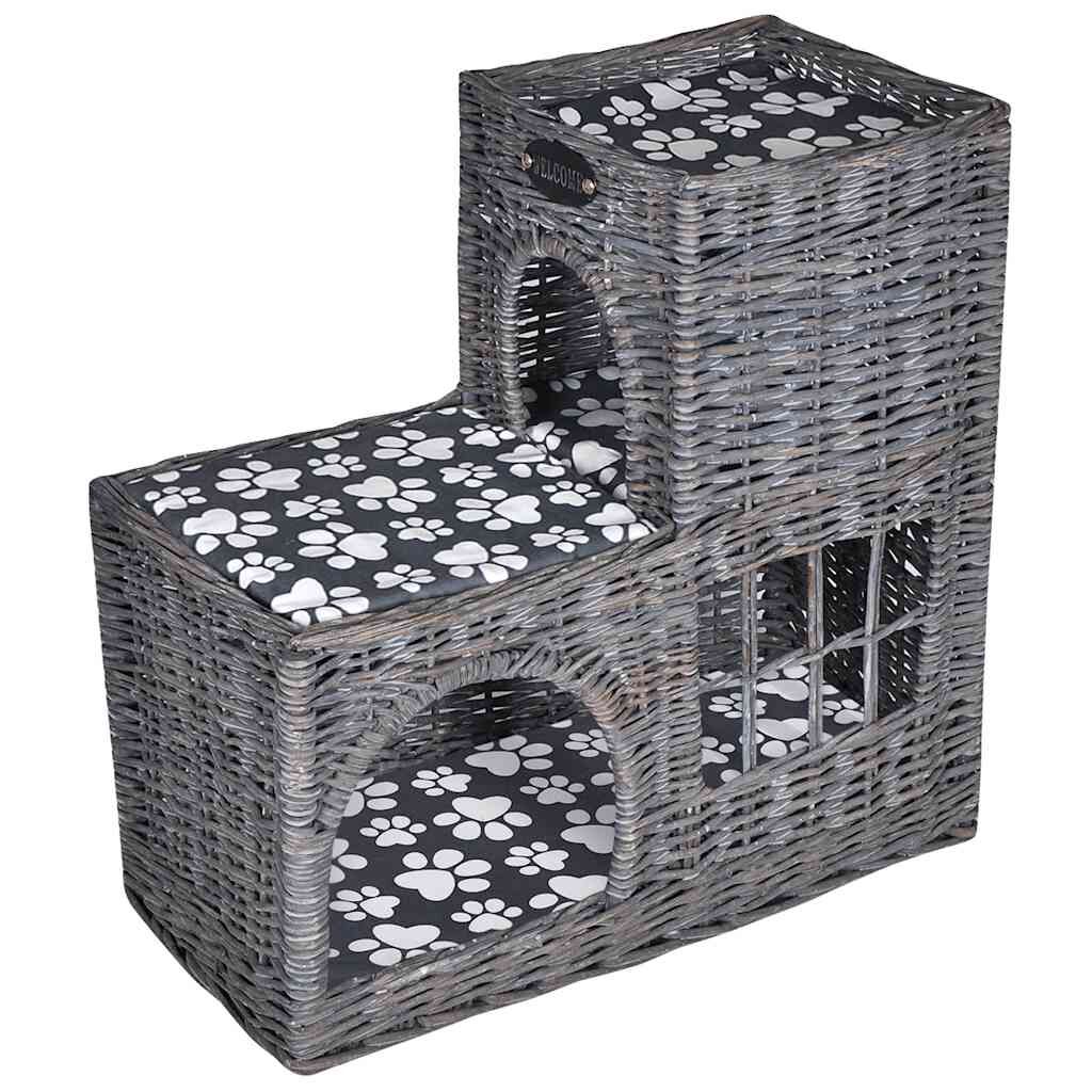 This cat house/castle will not only give your pet a comfortable place to sleep and relax in, but its classic willow design will suit any interior. It will make a great gift for your pet or animal loving friend! This is an extravagant and elaborate woven cat bed. The included thickly padded soft cushions make it really cozy and snug. Made of willow, this pet house is sturdy, yet lightweight enough to carry along. This pet house can also be used outside, in the garden or on the patio, for your cat, kitten, dog or puppy to sleep, rest or play. Pets will enjoy the sunshine while lounging on the top floor!