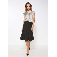 This skirt is designed to sit lower on the waist. The panels are cut on the bias to create the fluted drape on the skirt. The skirts finished length is approximately mid-calf.